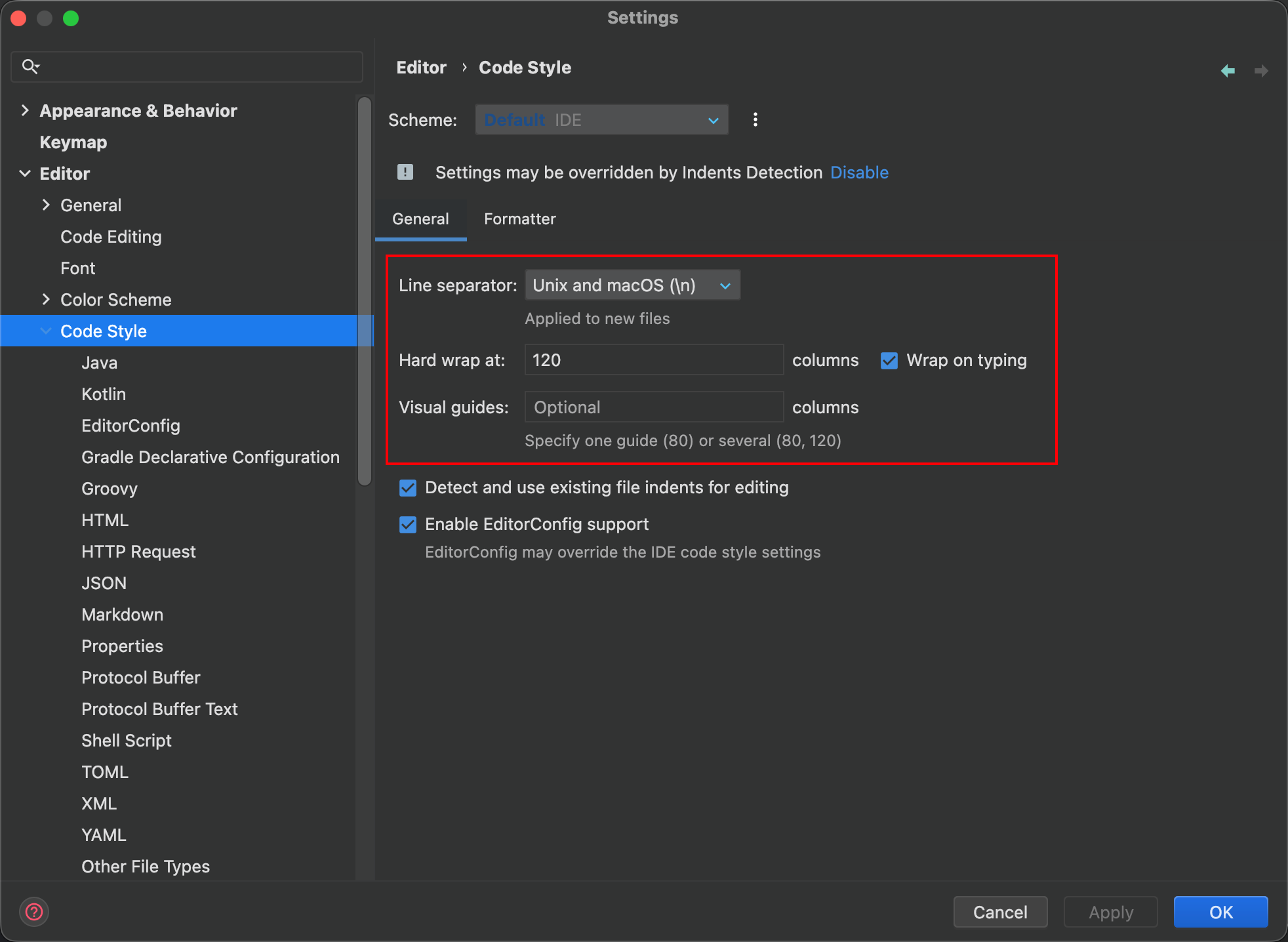 Ensure right marigin is not exceed:当执行代码格式化时,根据限定长度换行。(勾选)