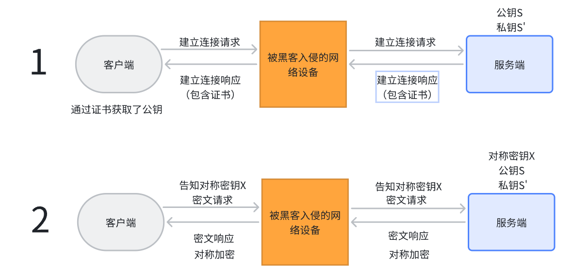 - 双方开始采用 X 进行对称加密,进行通信。但是此时中间人也拿到了密钥X,劫持