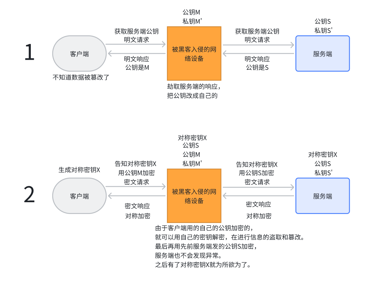 成为自己的公钥 M,并将伪造报文发给客户端。 - 客户端收到报文,提取公钥 M(不知道公钥被更换过了) ,自己形成对称密钥 X,用公钥 M 加密 X,形成报文发送给服务器。