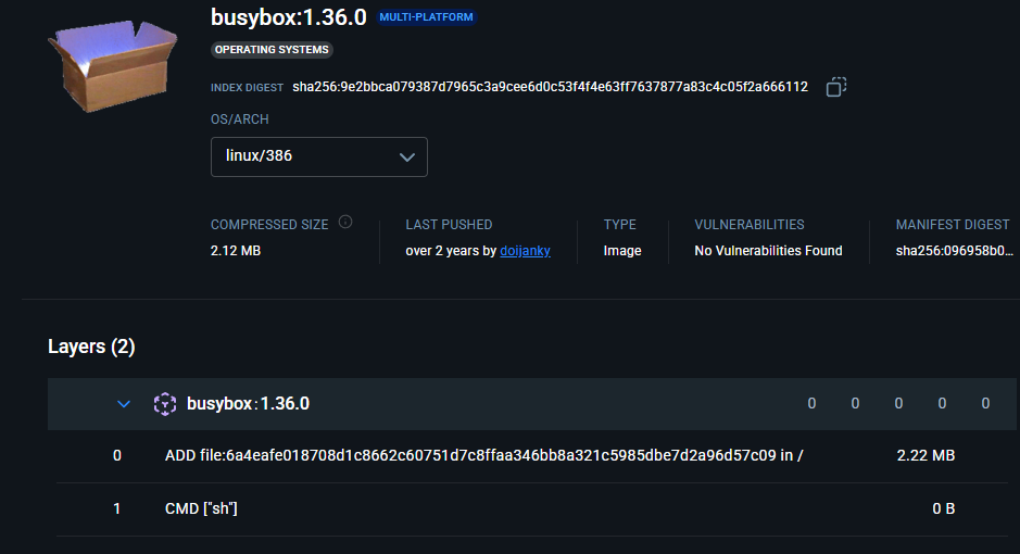 busybox:1.36.0 9e2bbca07938 7.58MB 2.59MB