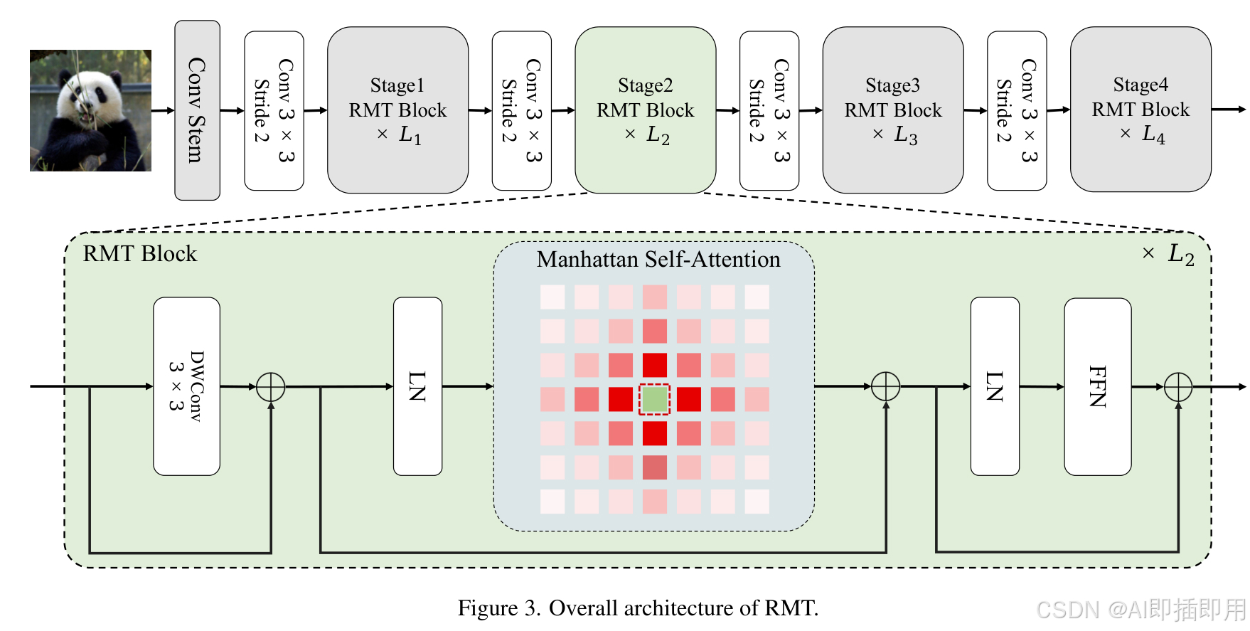 RMT 采用了类似 ResNet/Swin Transformer 的 分层(Hierarchical)架构,包含 4 个阶段(Stage):