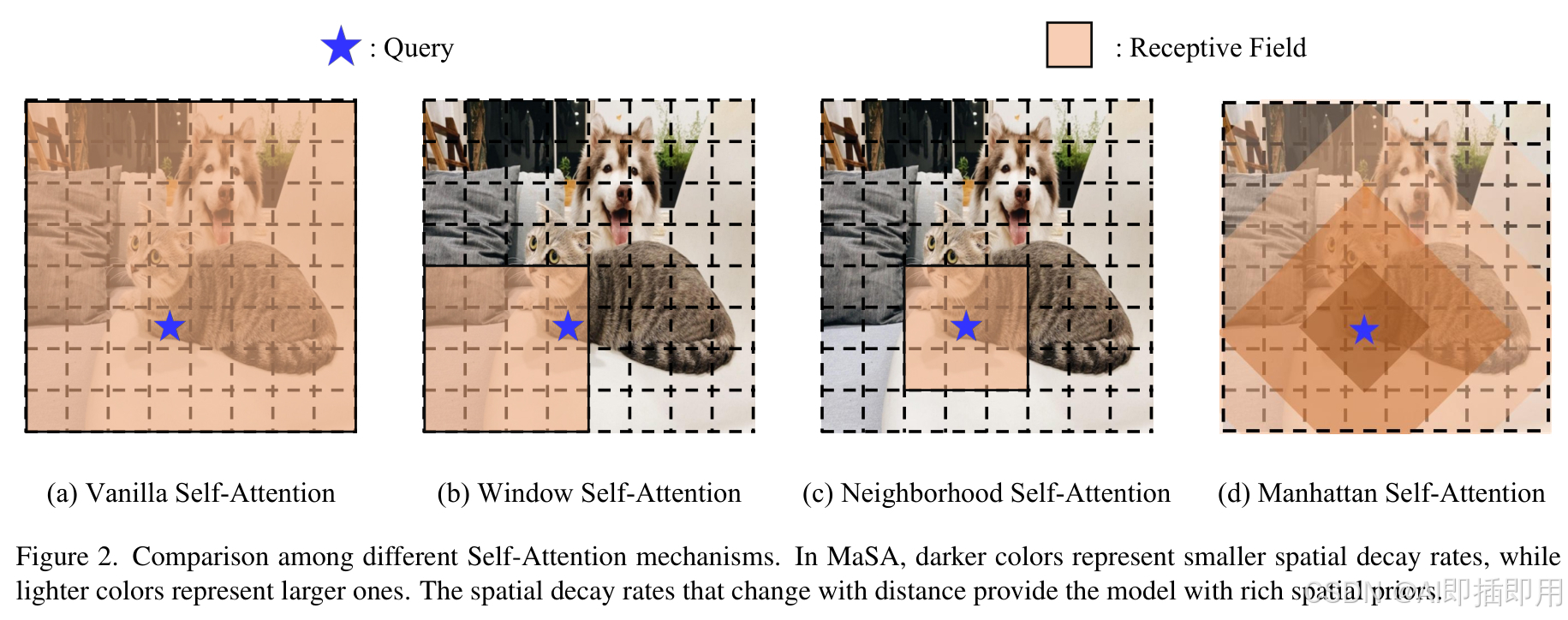 - 基于曼哈顿距离的 2D 空间先验:将 RetNet 的一维指数衰减扩展到二维图像空间,利用曼哈顿距离构建显式的空间衰减矩阵,完美契合图像的网格结构。