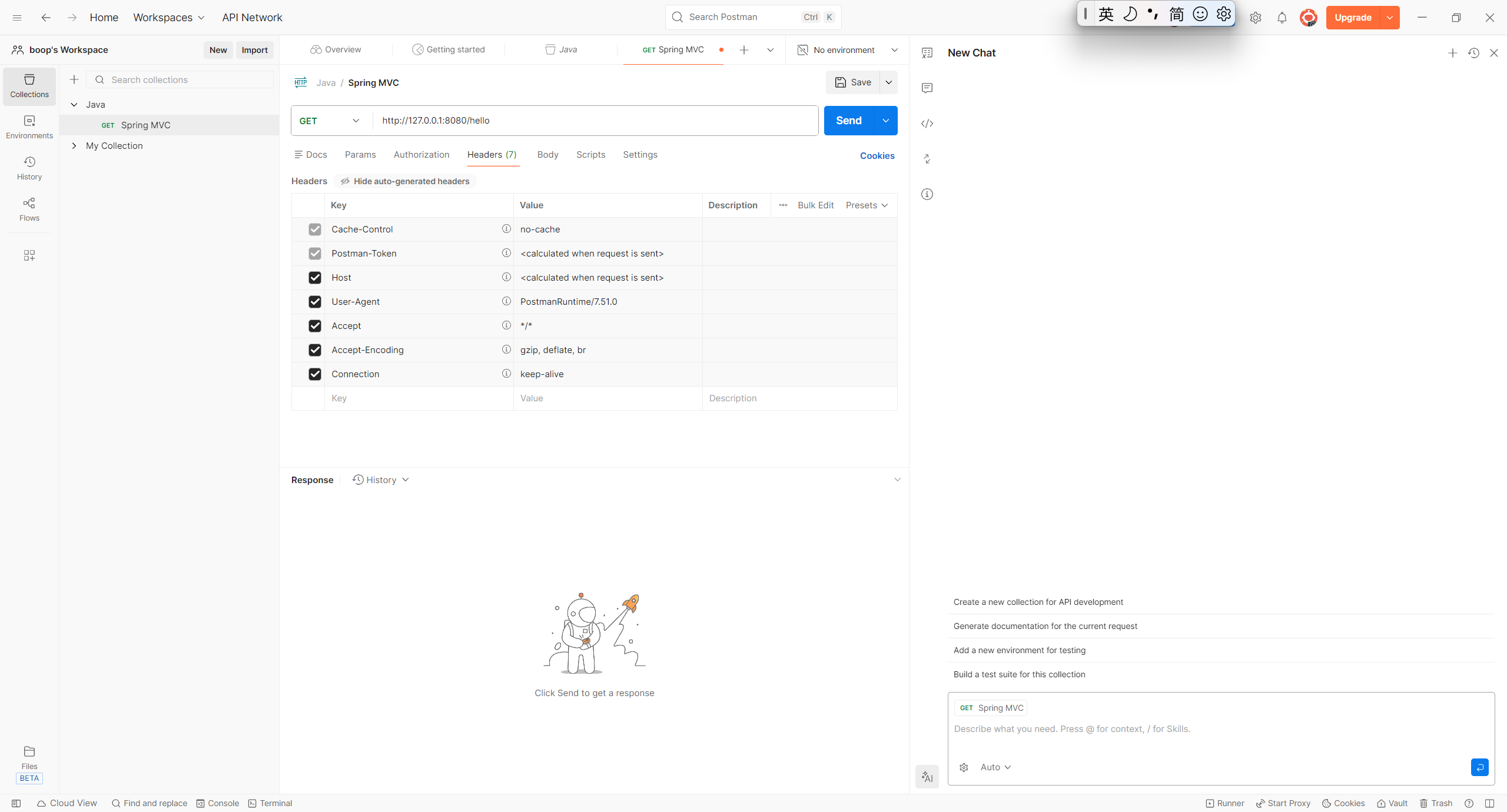 发送与查看:点击「Send」按钮,在下方「Response」面板查看响应状态码、响应体(格式化展示)
