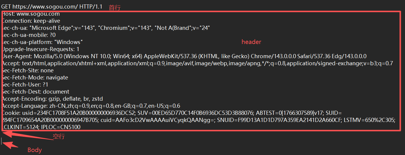 - Body : 空行后面的内容都是 Body ; Body 允许为空 ; 如果 Body 存在 , 则在 Header 中会有一个 Content-Length 来标识 Body 长度