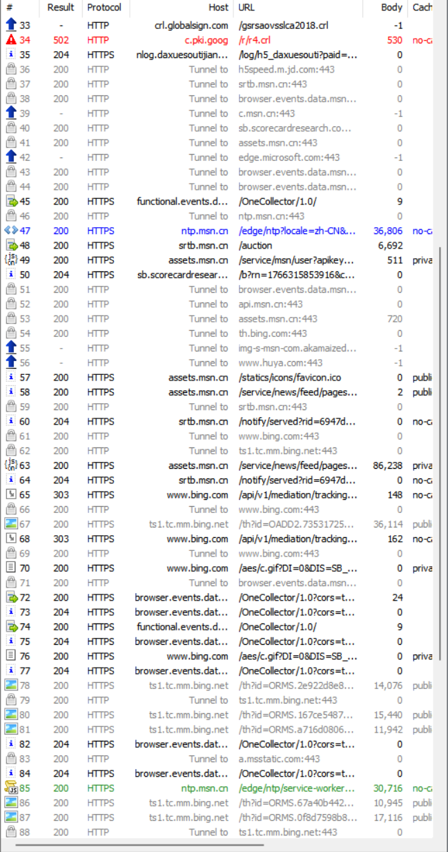 | 灰色 | 两种场景:1. 数据流类型为 CONNECT(HTTPS 连接建立阶段的请求)2. 响应资源类型为图片(如 JPG、PNG) |