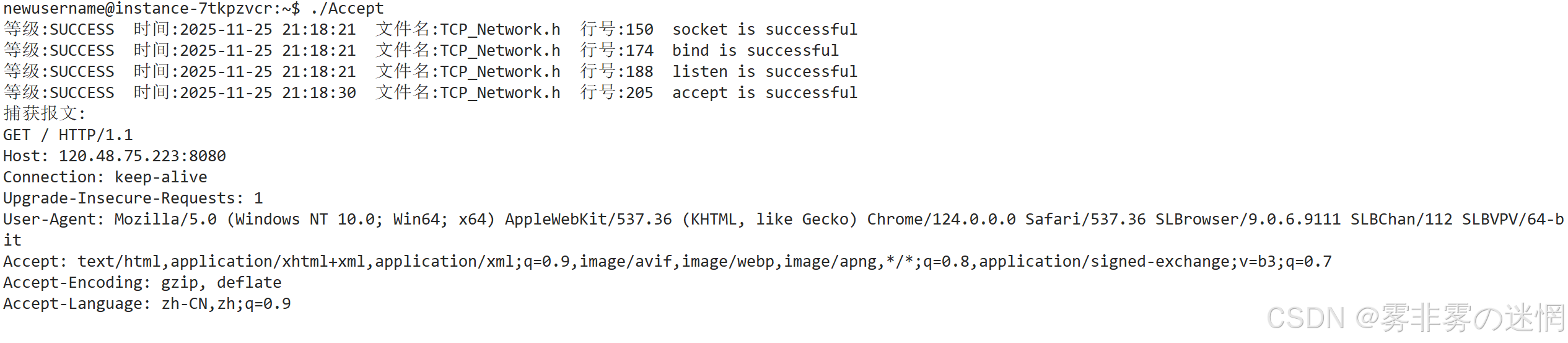 例如:用浏览器访问IP端口,再退出,即可查看(因为 recv 是阻塞的等待)