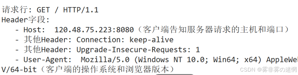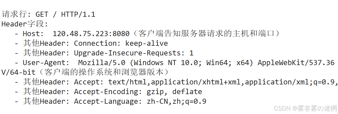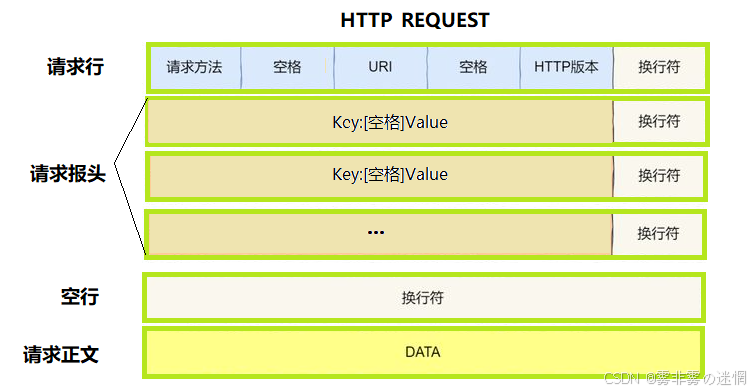 第一部分是请求行:包含请求方法、URI 和 HTTP 版本,用空格分隔,最后以换行符结束