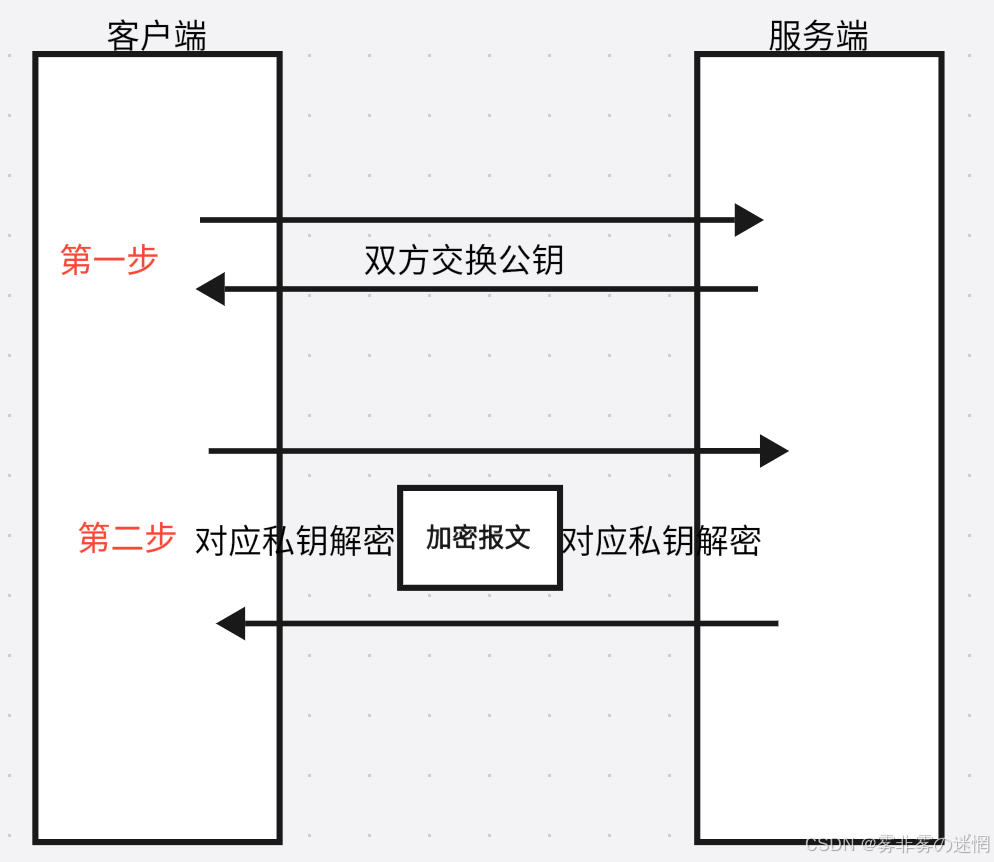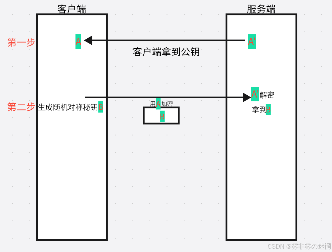 传输方式:服务器持一套秘钥,将公钥给客户端,客户端生成一个对称秘钥,再用刚才拿到的公 钥对对称秘钥加密传给服务端,后面双方用客户端的对称秘钥通信