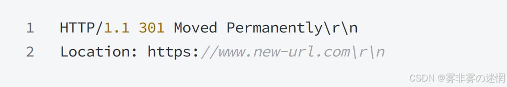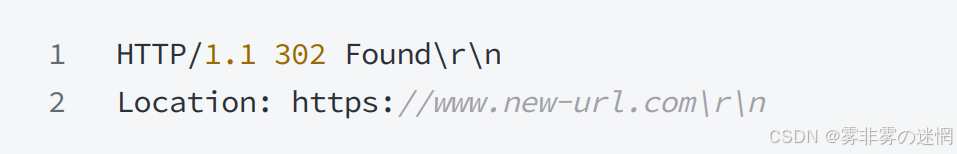 动作: 在这种情况下,服务器会在响应中添加⼀个Location头部,⽤于指定资源的新位置。这个 Location 头部包含了新的URL地址,浏览器会⾃动重定向到该地址,例如: