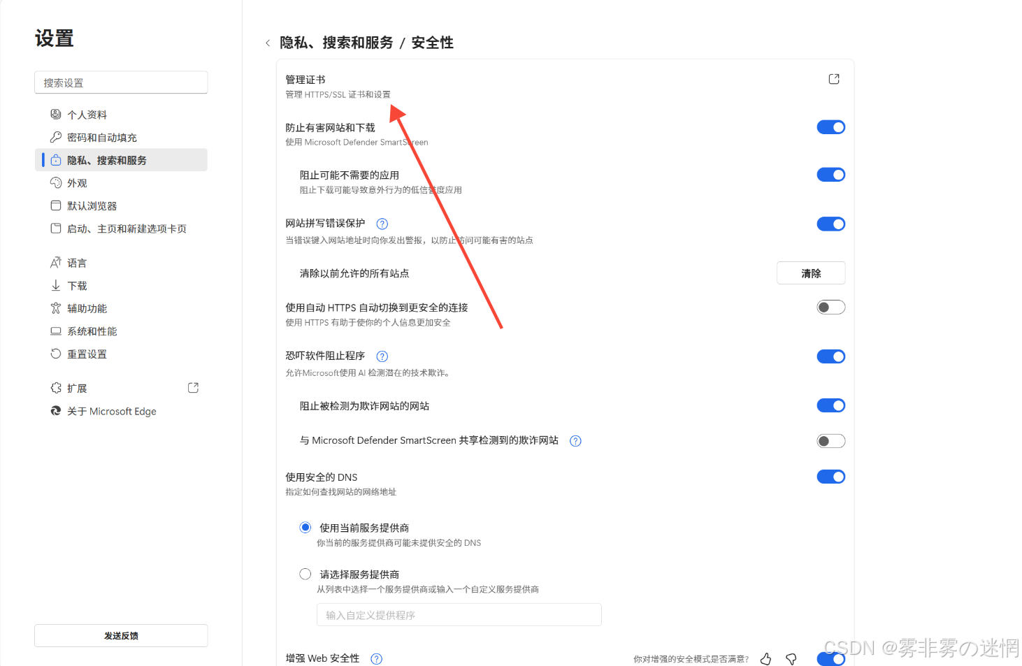 可以在浏览器的设置->安全中查看该浏览器信任的证书: