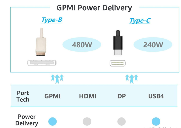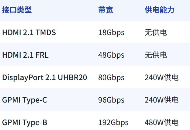 GPMI线材共分为Type-B与Type C,Type-C版本与现有USB Type-C接口兼容,最高可支持96Gbps的数据传输和240W的电力传输。GPMI Type-B 接口较大,能提供电高192Gbps带宽及480W电力传输。GPMI支持高达192Gbps的带宽和480W的供电能力,远超HDMI 2.1和DisplayPort 2.1。