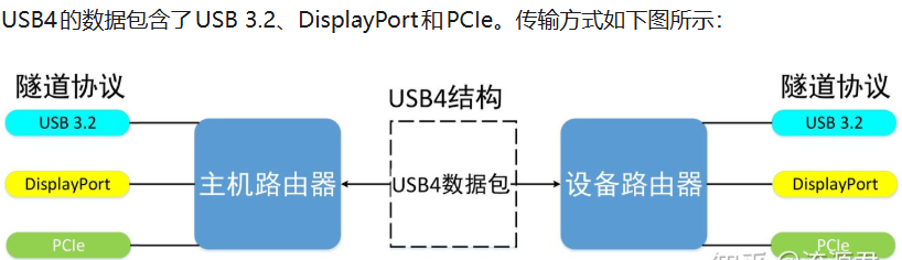 USB4 规范中阐明的目标是更高的传输带宽,帮助融合 USB-C 连接器的生态并"最大程度地减少终端用户的困惑"。USB4只支持USB Type-C接口,不再支持传统的Type-A(Standard-A)接口和Type-B(Micro-B)接口。隧道协议是一种将不同协议的数据包重新封装在一起传输的方式,数据包传递经过的路径叫做隧道。USB4规范中协议隧道分为USB 3.2隧道,DisplayPort隧道、PCIe隧道,三者可以统称为USB4隧道。