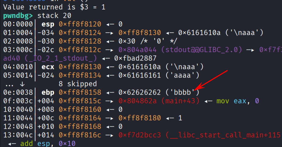 可以看到,此时ebp的值就是bbbb,所以这里我们发送0x28之后的数据需要修改ebp的值,然后将ebp迁移到新的地址上