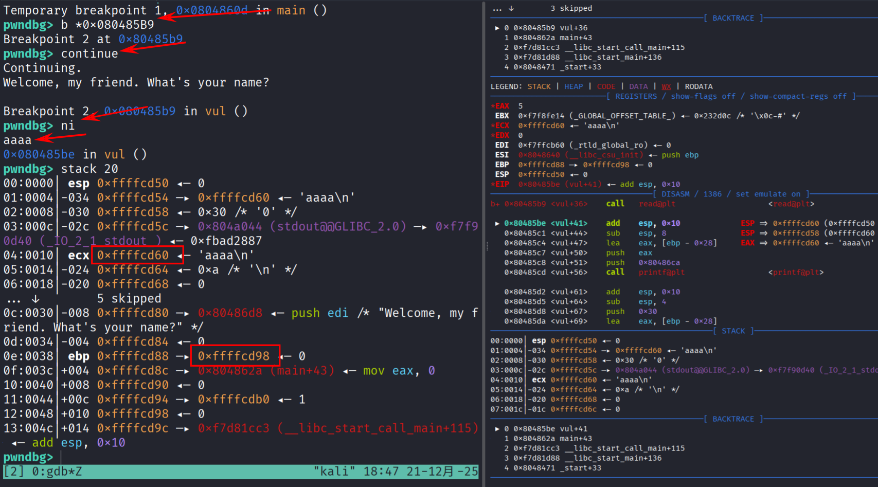 我们使用gdb调试,在最后vul函数leave的地方加断点,可以看到这里栈帧的布置顺序就是我们上面的布置顺序