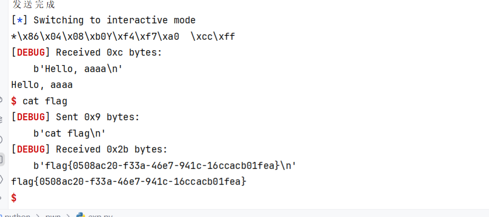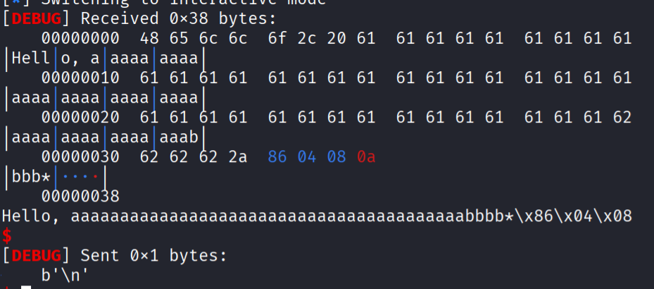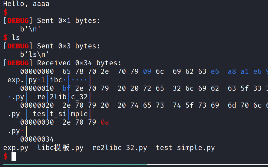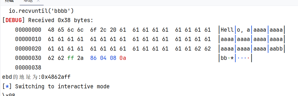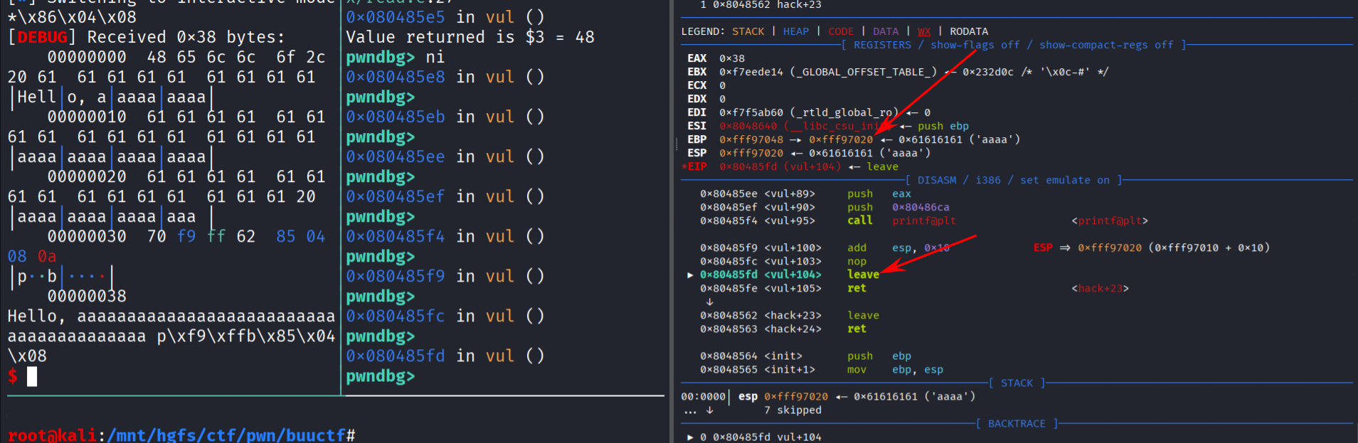 这里可以看到我们执行到leave ret的时候,ebp指向的地址是aaaa,也就是我们上面发送的payload1中的aaaa,所以这里只要我们将paylaod1中的aaaa构造成我们新的rop链,就可以进行栈迁移之后得到shell,所以我们需要构造栈帧