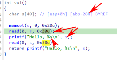这里可以看到,栈空间是0x28,可以读的是30,所以当读到0x28的时候,+0x4正好覆盖ebp,所以偏移量就是0x2c,又因为有prinf函数,后面直接打印出来地址,因为%s碰到\x00会截断,如果没有\x00就会连着打印后面的内容,所以我们将s填满之后不用\x00结尾,就会将地址全部输出,然后找到ebp的地址即可!