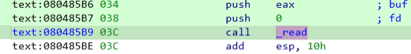接着就需要我们去寻找一下迁移的地址应该放到哪里,因为这里调用了两次read,所以我们可以将迁移地址放到esp的地方(也就是我们输入的数据的地址上),使用gdb调试动态找一下我们输入的地址在哪