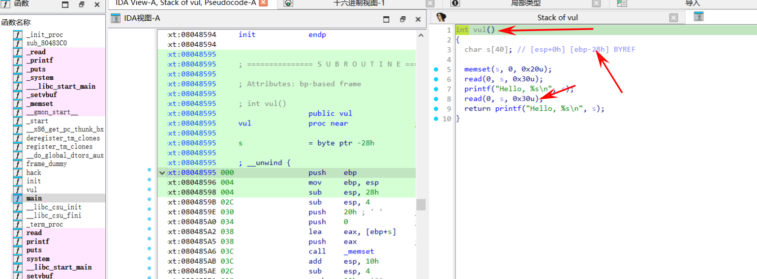 在main函数中调用了vul函数,read读取0x30的数据,但是栈空间有0x28,0x28+4覆盖ebp的值,0x2c+4为返回地址,而后没有可以构造的空间所以这里就没法利用栈溢出来,所以需要使用栈迁移(需要将栈空间迁移到一个足够大的空间上可以去构造新的ROP链)