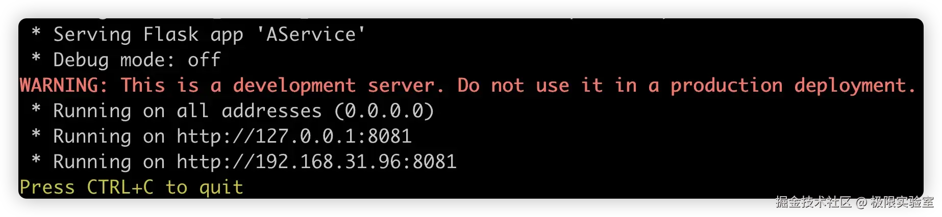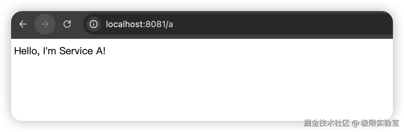 我们编写一个简单的 Flask 服务程序,只要访问 localhost:8081/a 就会返回 "Hello, I'm Service A!" 信息。