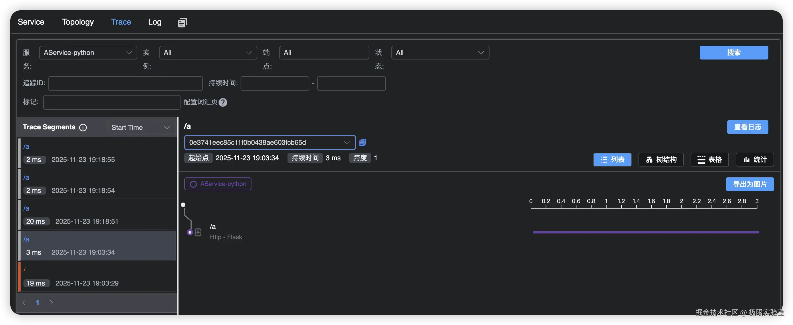可以看到服务 A 的调用信息都已经被记录到 Skywalking 中了。
