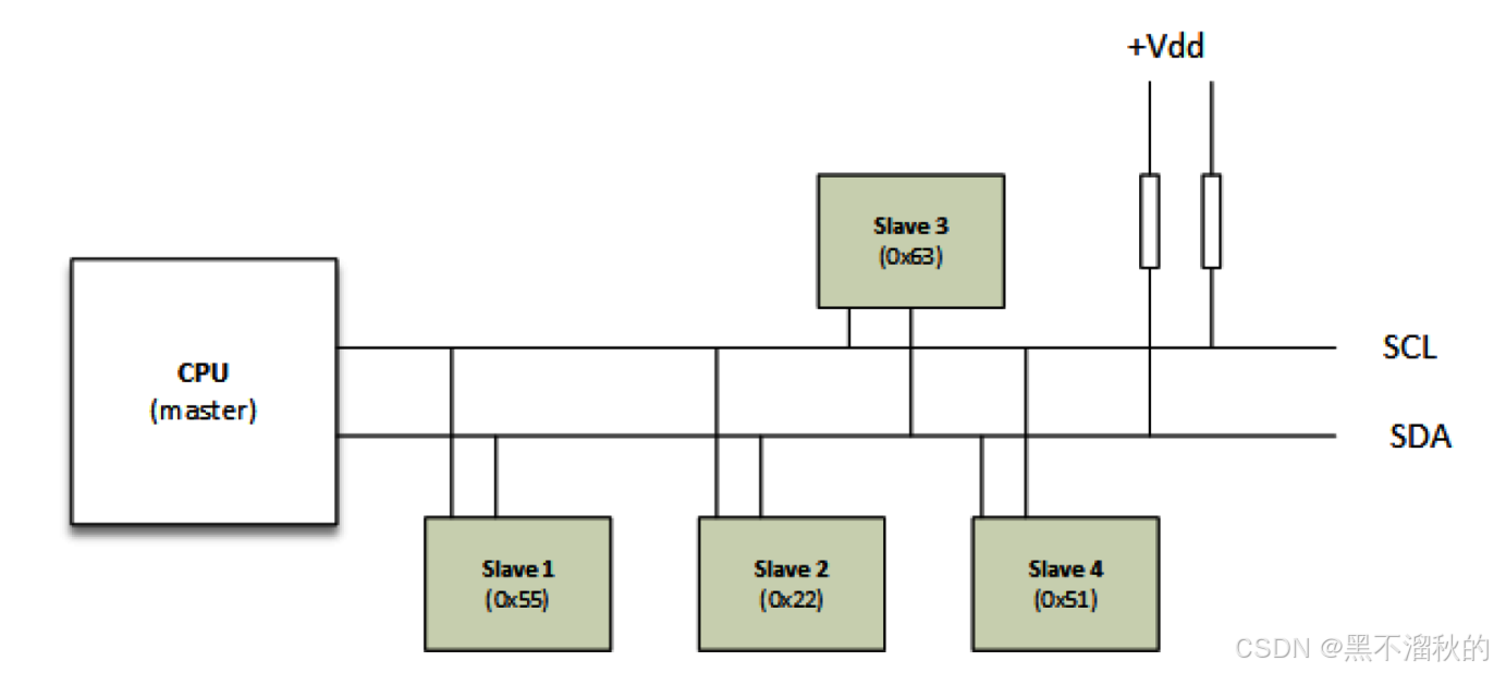 I2C(内部集成电路总线)是一种只用两根线的串行通信总线,一根传数据(SDA),一根传时钟(SCL)。主设备通过 SCL 控制数据传输,SDA 可以双向传输数据,从设备也能通过拉低 SCL 来延长时钟。总线上的信号线都是开漏的,需要上拉电阻才能变高。I2C 常用于嵌入式系统连接 EEPROM、RTC、GPIO 扩展器、传感器等外设。