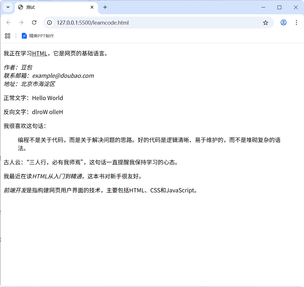 tips:对于 HTML,无法通过在 HTML 代码中添加额外的空格或换行来改变输出的效果。当显示页面时,浏览器会移除源代码中多余的空格和空行。所有连续的空格或空行都会被算作一个空格。