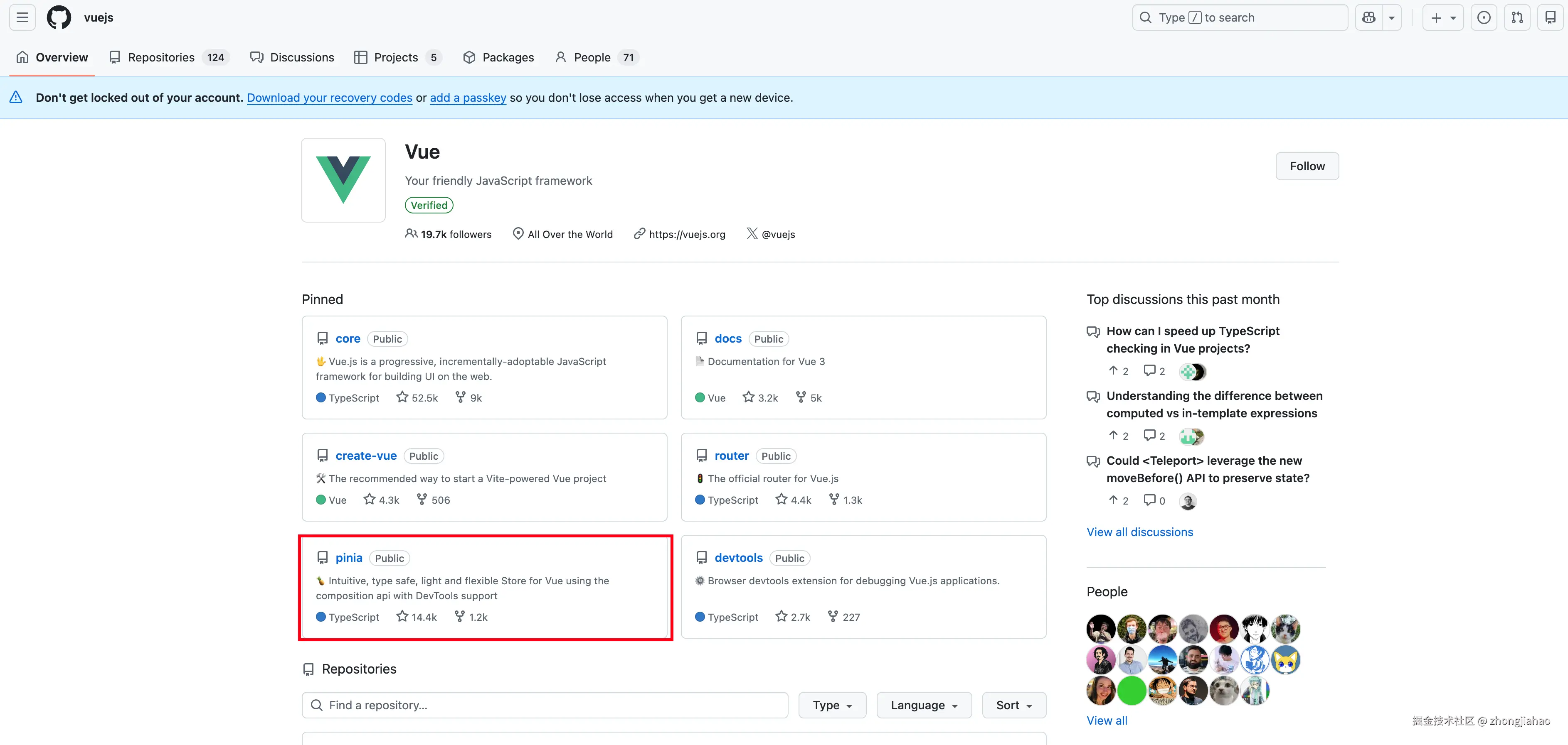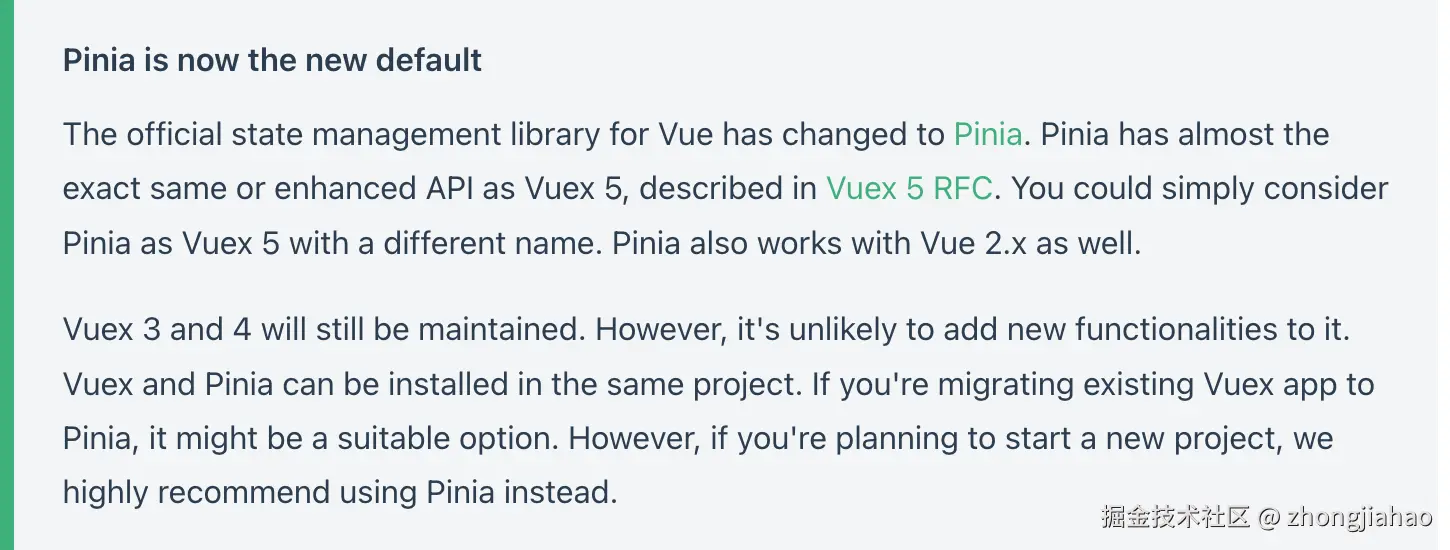 - 从官方的话可以知道Pinia 吸收了 Vuex 5 RFC 的设计方向,并最终成为 Vue 官方推荐的状态管理方案。 目前Pinia GitHub仓库已经纳入vuejs组织下