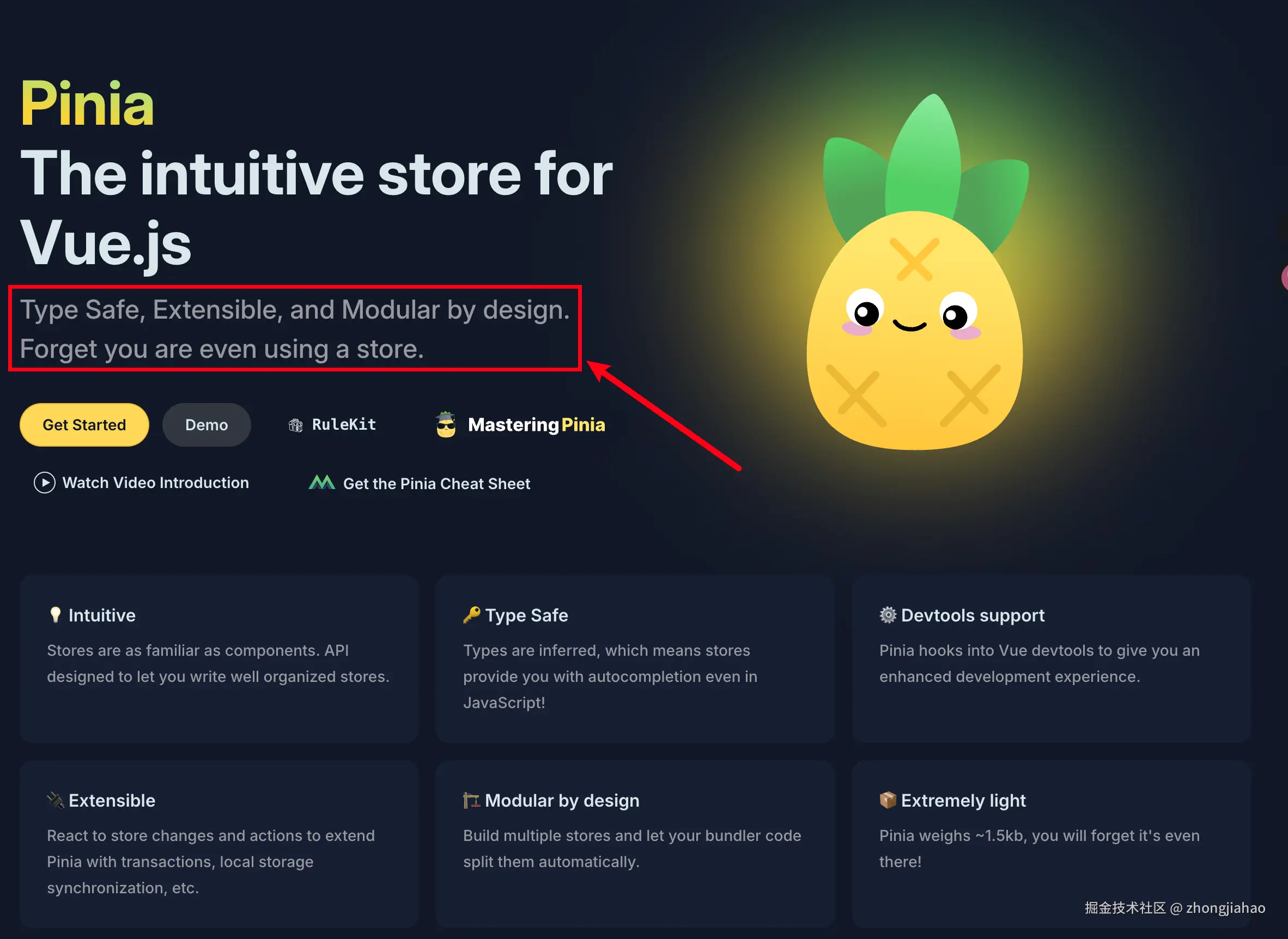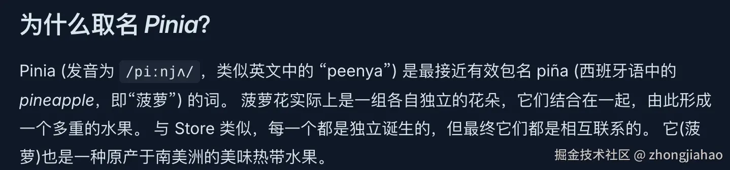- 为什么取名 Pinia? Pinia是西班牙语中Piña(菠萝)