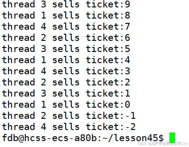 当ticket被减到1后,多个线程同时进入该临界区,判断ticket > 0条件成立,多个线程同时进入if条件判断,然后多个线程串行执行if内部代码逻辑,第一个线程把物理内存中ticket位置的变量1拷贝到CPU中,完成ticket--后把结果0拷贝回物理内存的ticket位置,接着第一个线程被切走,然后把自己的硬件上下文带走,然后OS调度第二个线程执行if内部代码逻辑,首先它把物理内存中已经被改为0的ticket变量拷贝到CPU寄存器中,执行ticket--后把结果-1拷贝回物理内存的ticket位置,然后调用printf就打印出-1了。