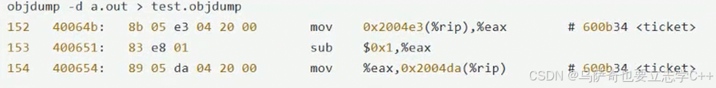 现在我们把票数减到负的原理谈清楚了,现在还有一个问题,ticket--这个操作是线程安全的吗?答案是否定的,因为ticket--并不是原子的,它经过汇编之后会转化成三条指令,如下图所示:
