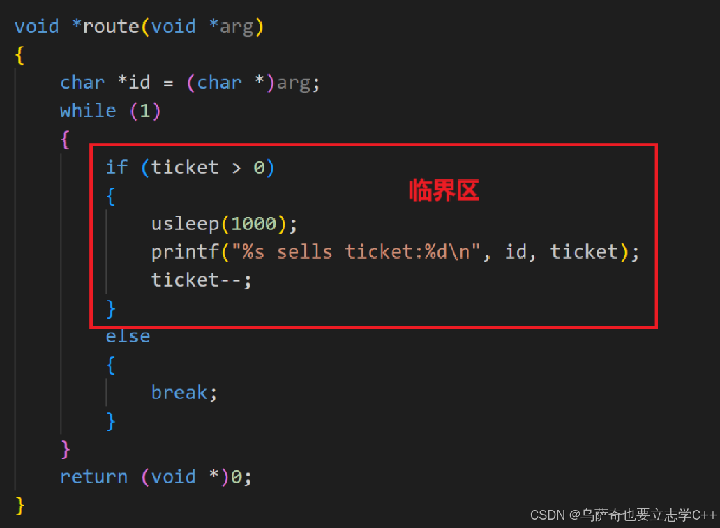 首先我们看访问共享变量ticket的核心代码,如上图红框框起来的部分,我们称之为临界区,理解区中右两个访问共享资源的地方:ticket > 0 和 ticket--,无论是ticket > 0这样判断真假的逻辑运算还是ticket--这样的算术运算都需要由CPU来完成。