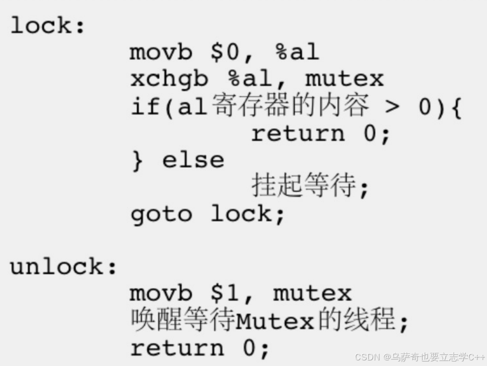 为了实现互斥锁操作,⼤多数体系结构(如X86,arm等等)都提供了swap或exchange指令,该指令的作⽤是把寄存器和内存单元的数据相交换,由于只有⼀条指令,保证了原⼦性,下面是加锁和解锁操作的汇编指令: