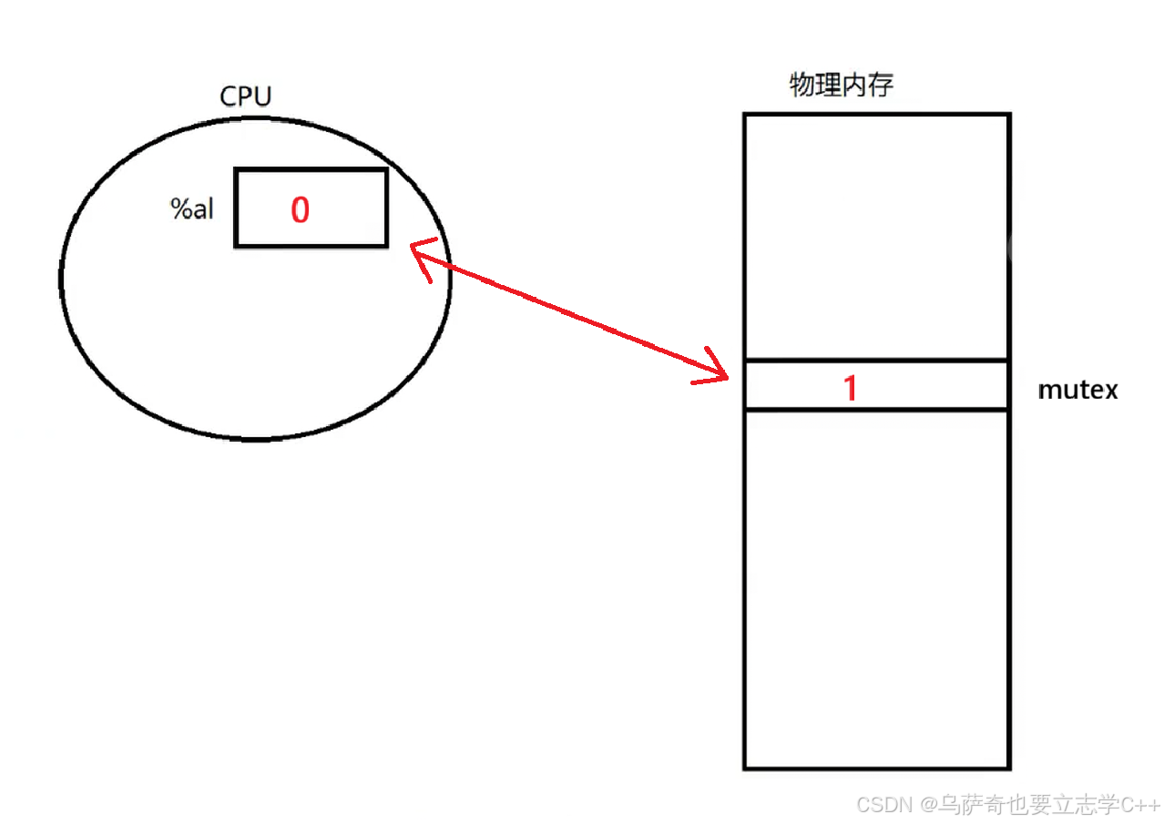 虽然pthread库对互斥锁做了封装,我们先简单把互斥锁mutex当成一个整型变量,值为1,加锁第一步线程会先将cpu中的al寄存器中的值置为1,然后将al寄存器中的值和互斥锁mutex值做交换,这样1就换到了al寄存器中,内存中的mutex变量交换后就变成0了,我们要理解这里交换操作的本质:以非拷贝的形式把1这个数字由共享变为私有,因为这样1就会变成申请锁线程的硬件上下文。线程继续执行后面的if判断,判断成立返回0申请锁成功。