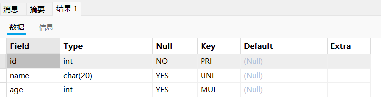 age字段对应的key为mul(multiple key),表示的是非唯一索引,即普通索引。