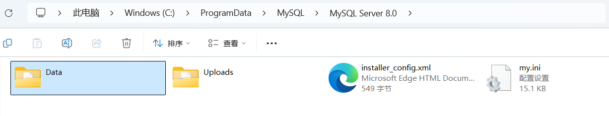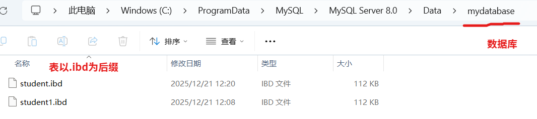 在B+树中每一个节点都是一个页:非叶子节点为索引页 ,叶子节点为数据页 。MySQL创建的数据默认存储在以下路劲中:C:\ProgramData\MySQL\MySQL Server 8.0\Data(8.0是版本号,具体以使用的版本号为主),可以看到创建的数据库,打开数据库可以看到表的信息