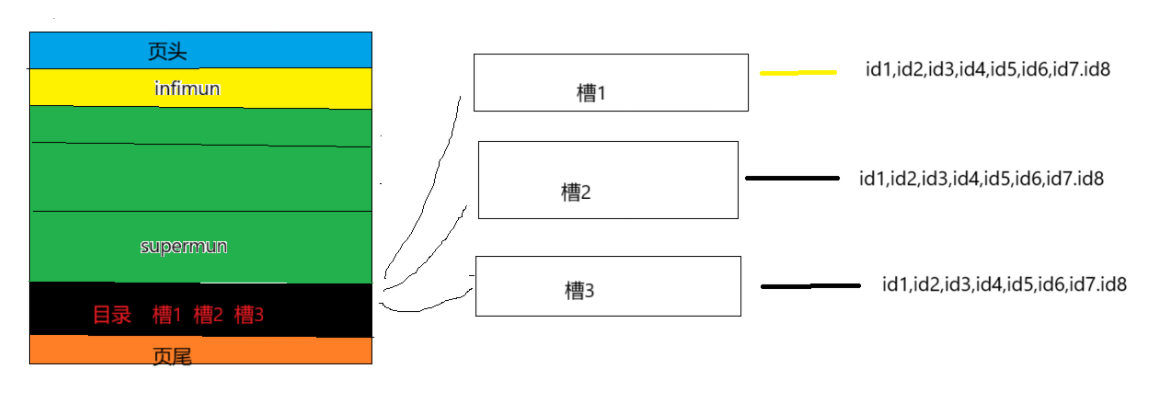 页中有一行用来存储目录信息,在数据行中每一行都有一个id,将这样id每8个为一组作为一个槽,每一个槽按照从小到大编号,存储目录信息的行对应存储的就是一个一个的槽,需要查找页中的某一条数据,可以先二分查找到对应的槽,再到槽中查找数据行id。