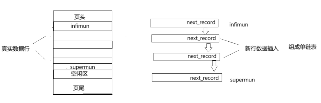 在创建页时会创建一行来记录最大行supermun和最小行infimun的信息,记录真实数据行的范围,数据行中有一个record_next,用来记录下一数据行的位置。数据行以单链表的形式组织,当新的数据行插入,与单链表的插入类似进行修改。