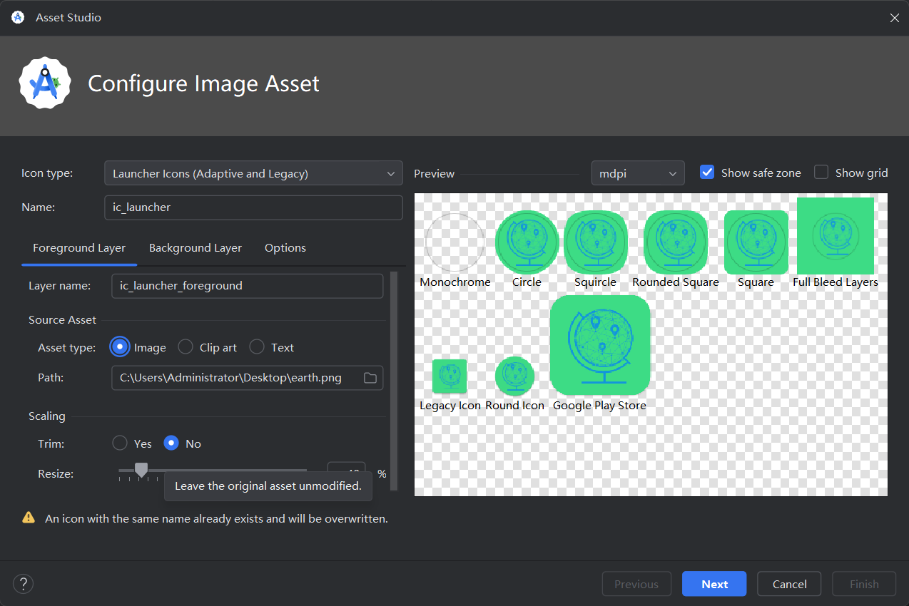 - Next → Finish(会自动覆盖并生成所有 mipmap-* 尺寸资源)