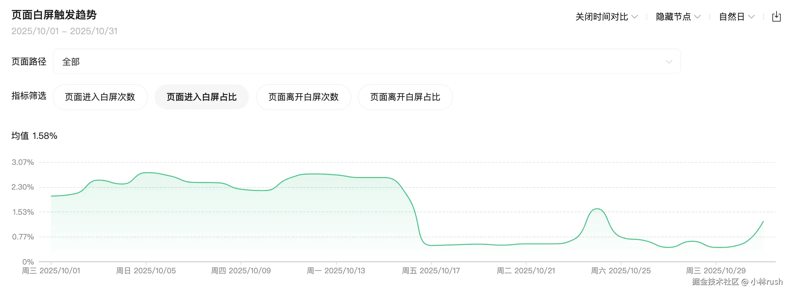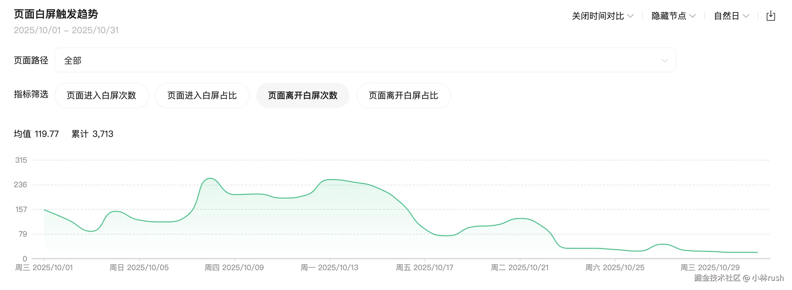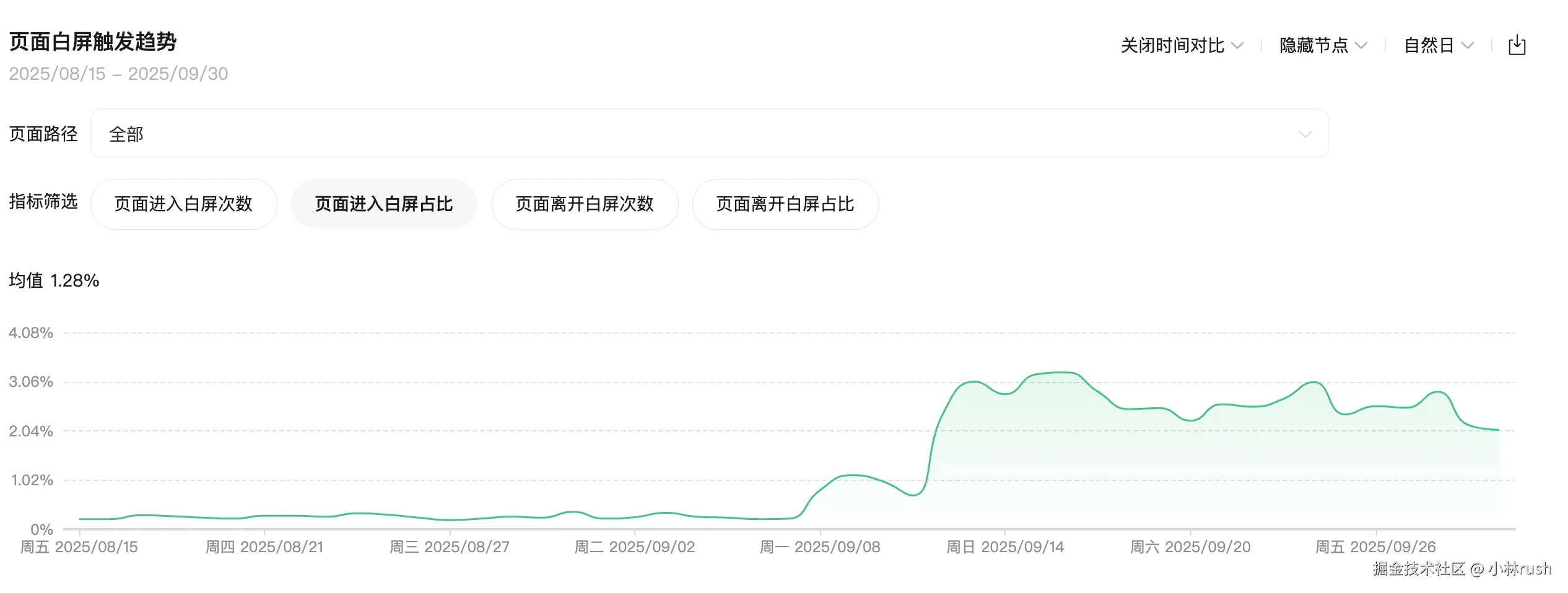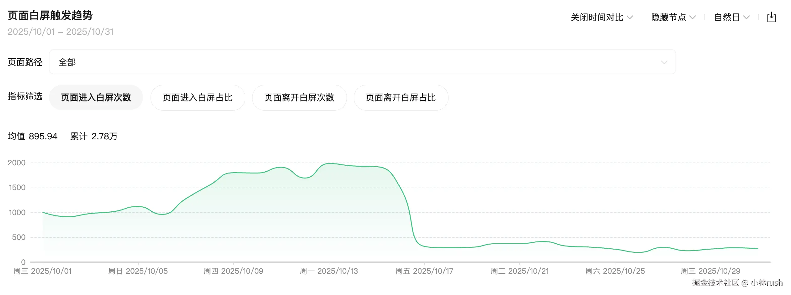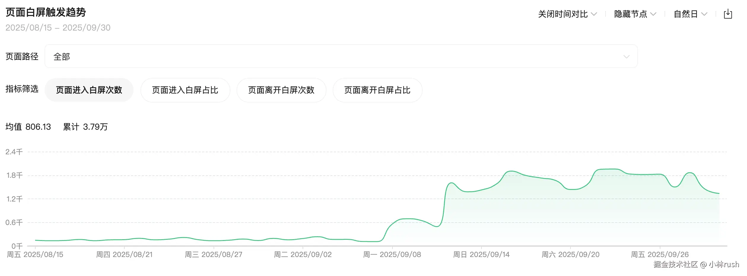 "视觉 Tabbar"方案虽然暂时解决了主包大小问题,但随着业务代码的累积,其体验弊端在2025年9月集中爆发。数据显示,页面白屏次数和用户占比急剧上升,优化迫在眉睫。