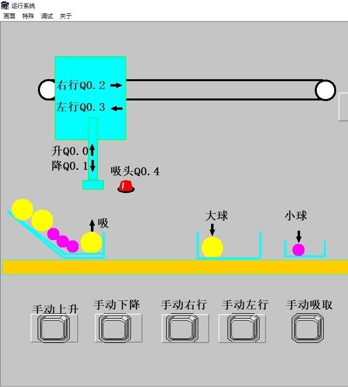 - 输出控制:根据判断结果,控制相应的执行机构,如气缸、电机等,将小球分拣到对应的位置。假设控制大球分拣气缸的输出点为Q0.0。