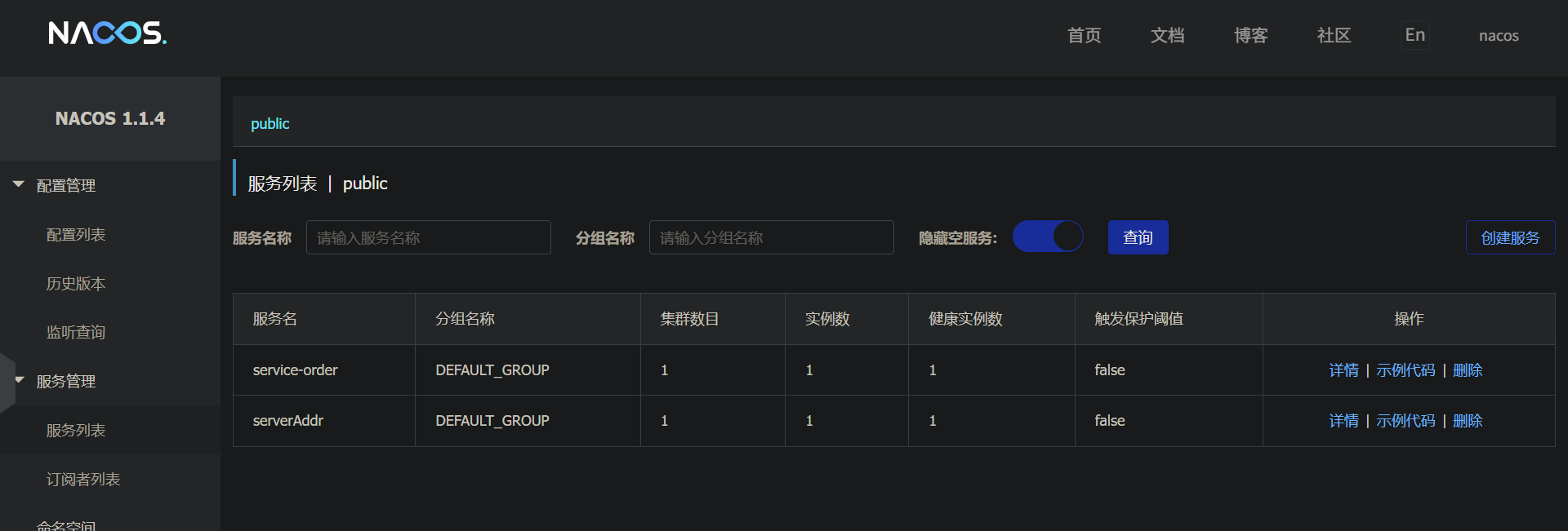 启动后在 Nacos 的服务列表下面可以看到一个名为 serverAddr 的服务。