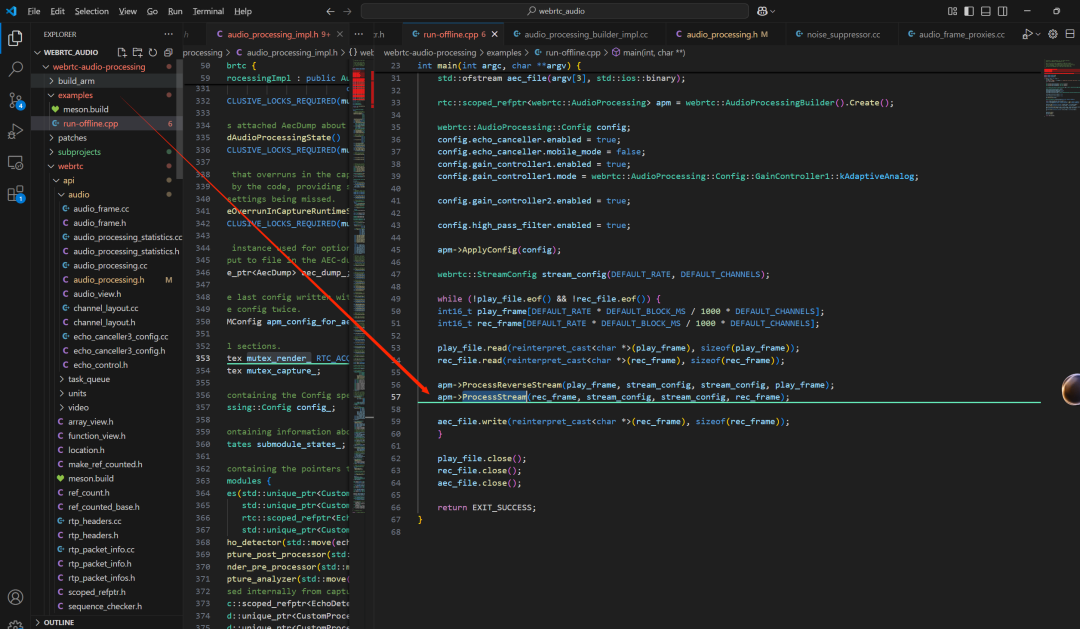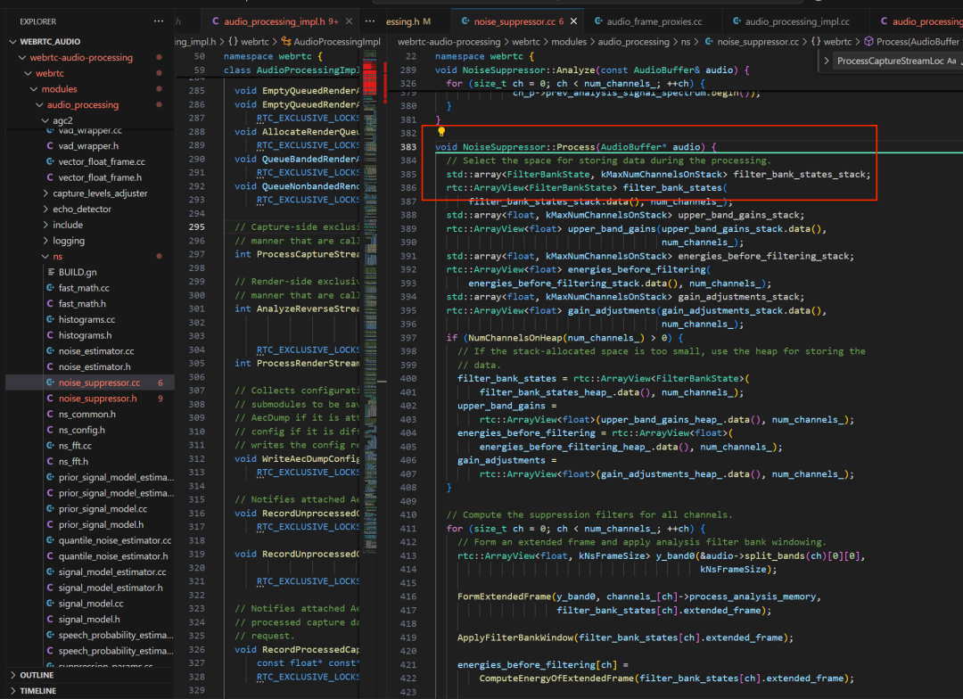 这里我们暂时不会讲解源码,这里只是为后续讲解做铺垫,首先这里要学习降噪的算法原理细节,肯定是要看源码的,所以整个处理入口要找到类似下面的处理