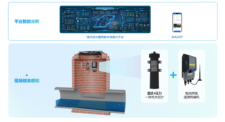 测站配置高精度双路水位传感器,雷达水位计和压力式水位计互补式测量窨井水位,避免测量盲区,毫米级变化尽在掌握