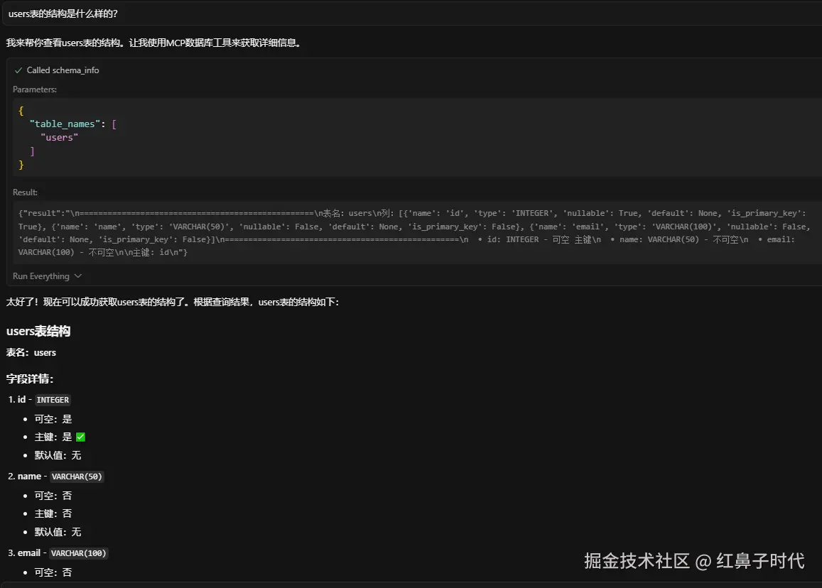 简单查询: "查询users表中的所有数据" AI执行:SELECT * FROM users