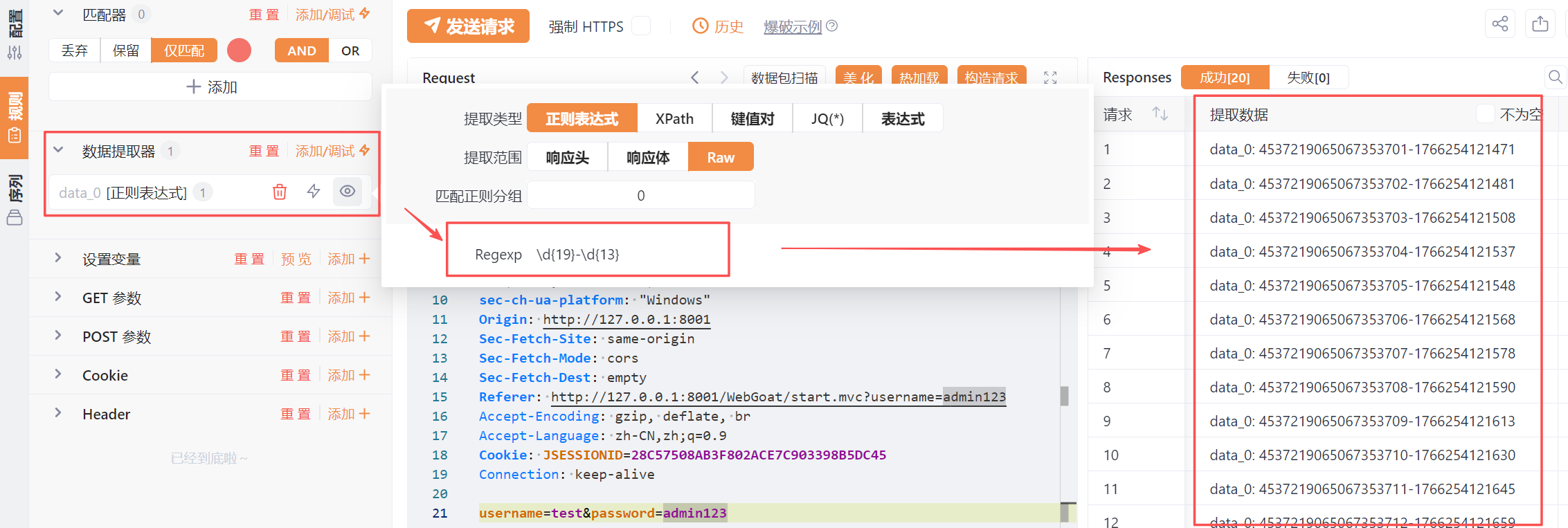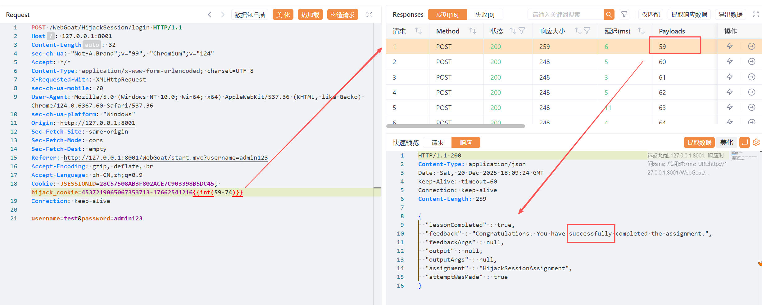 在该关卡中,通过抓包分析发现,响应头中hijack_cookie参数的结构存在明显规律:其由 "19 位递增整数" 与 "毫秒级时间戳" 两部分拼接而成,其中整数部分会随服务器接收的请求数逐次累加。借助这一可预测的生成模式,攻击者通过枚举时间戳、结合整数递增规律,可快速爆破出合法用户的cookie会话凭证,最终成功实现会话劫持。