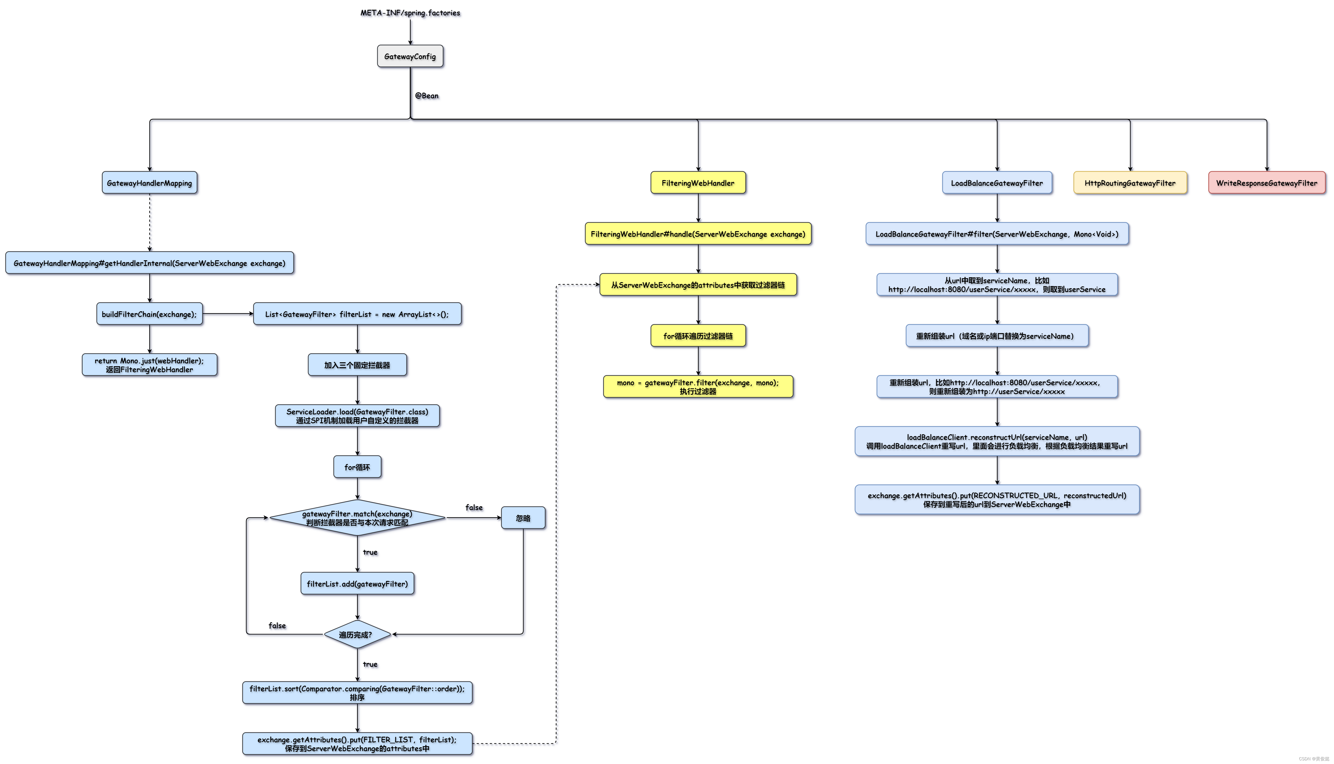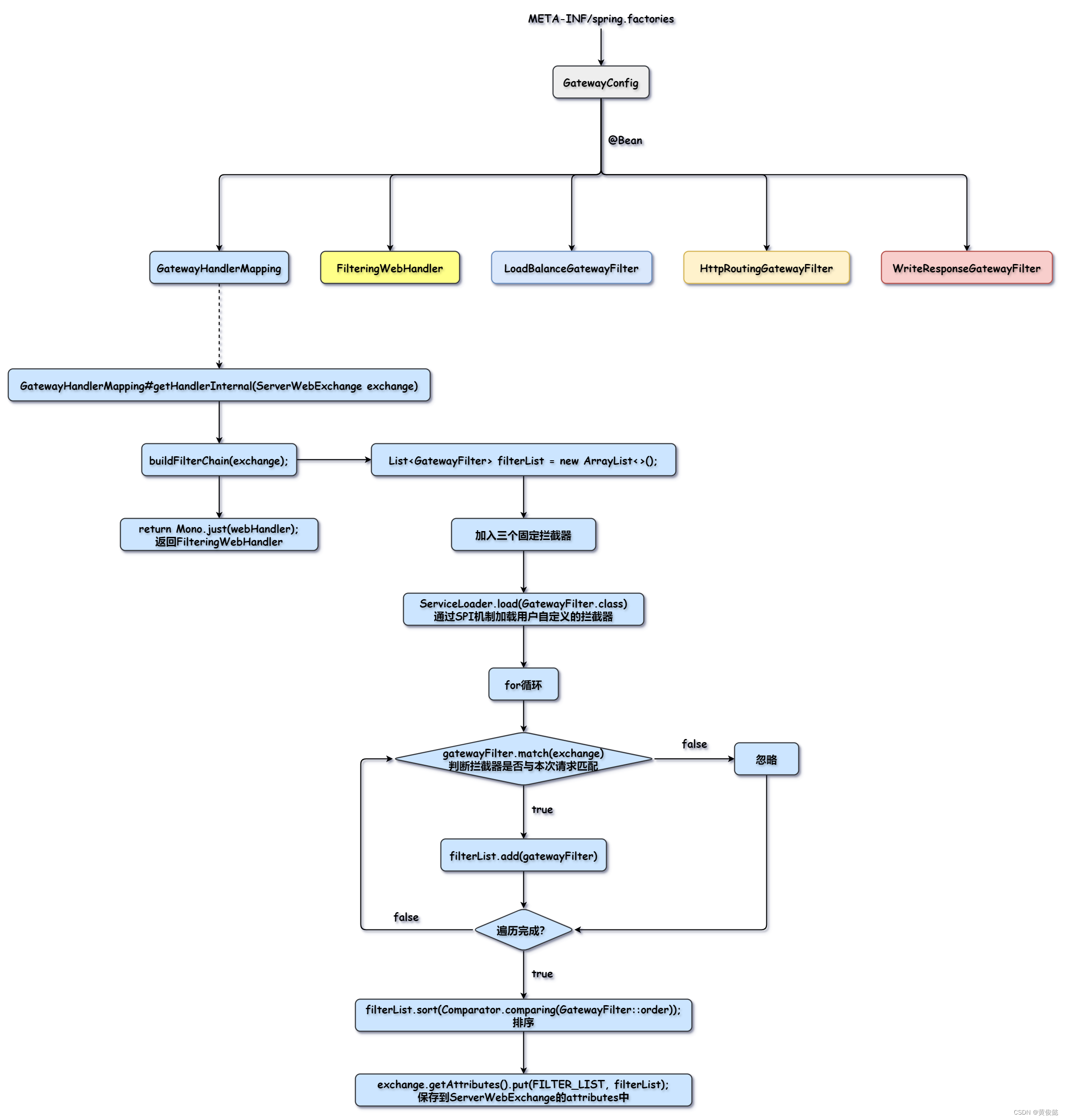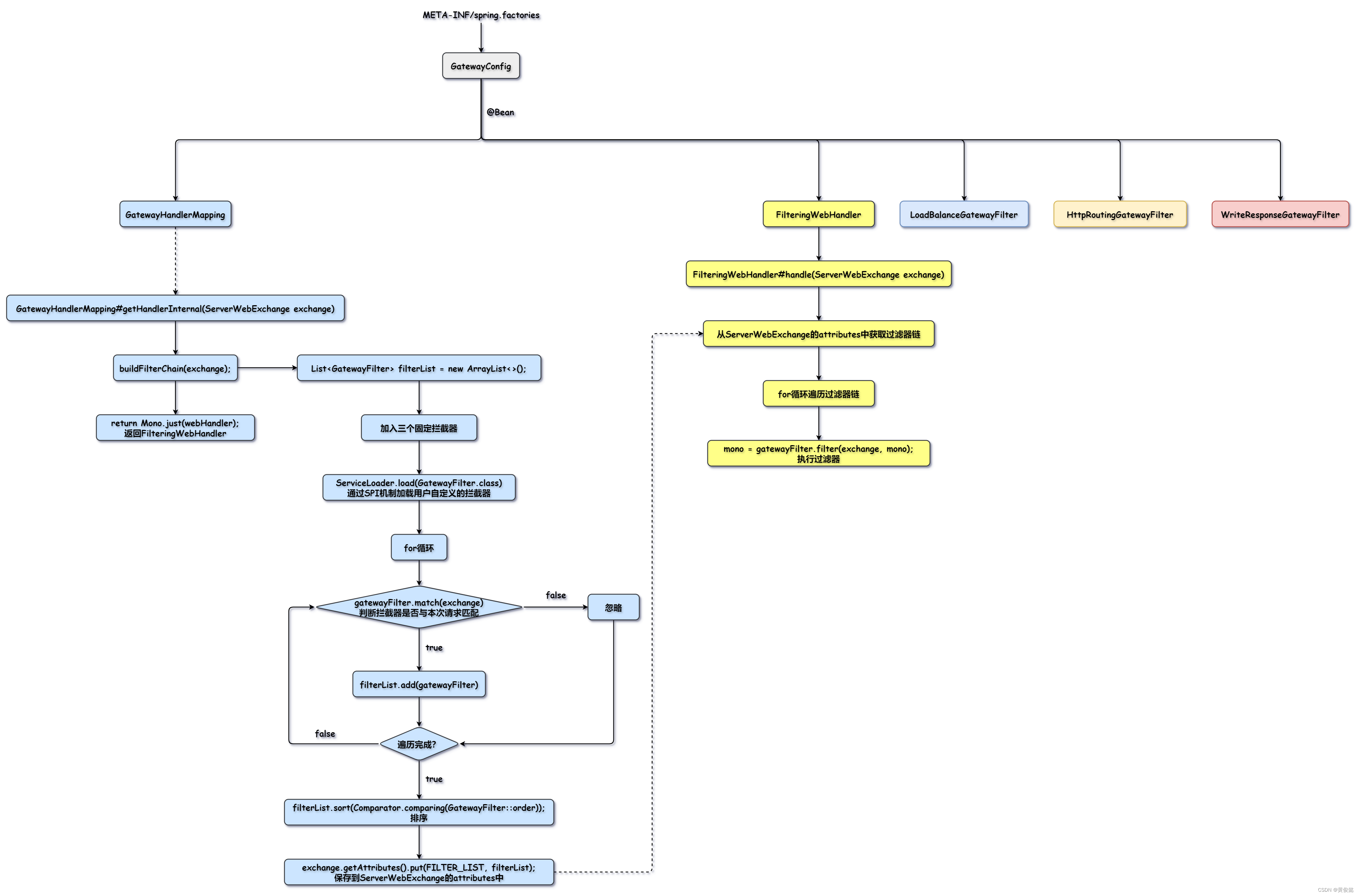 我们通过SpringBoot的自动装配机制加载我们的配置类GatewayConfig,通过GatewayConfig向Spring容器注册我们的核心类型:GatewayHandlerMapping、FilteringWebHandler以及三个固定的拦截器。