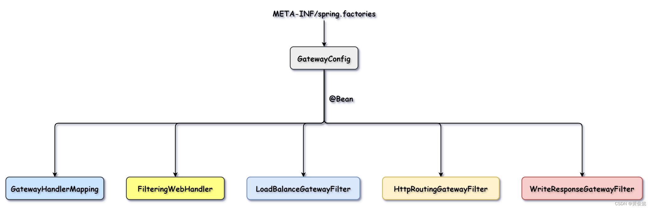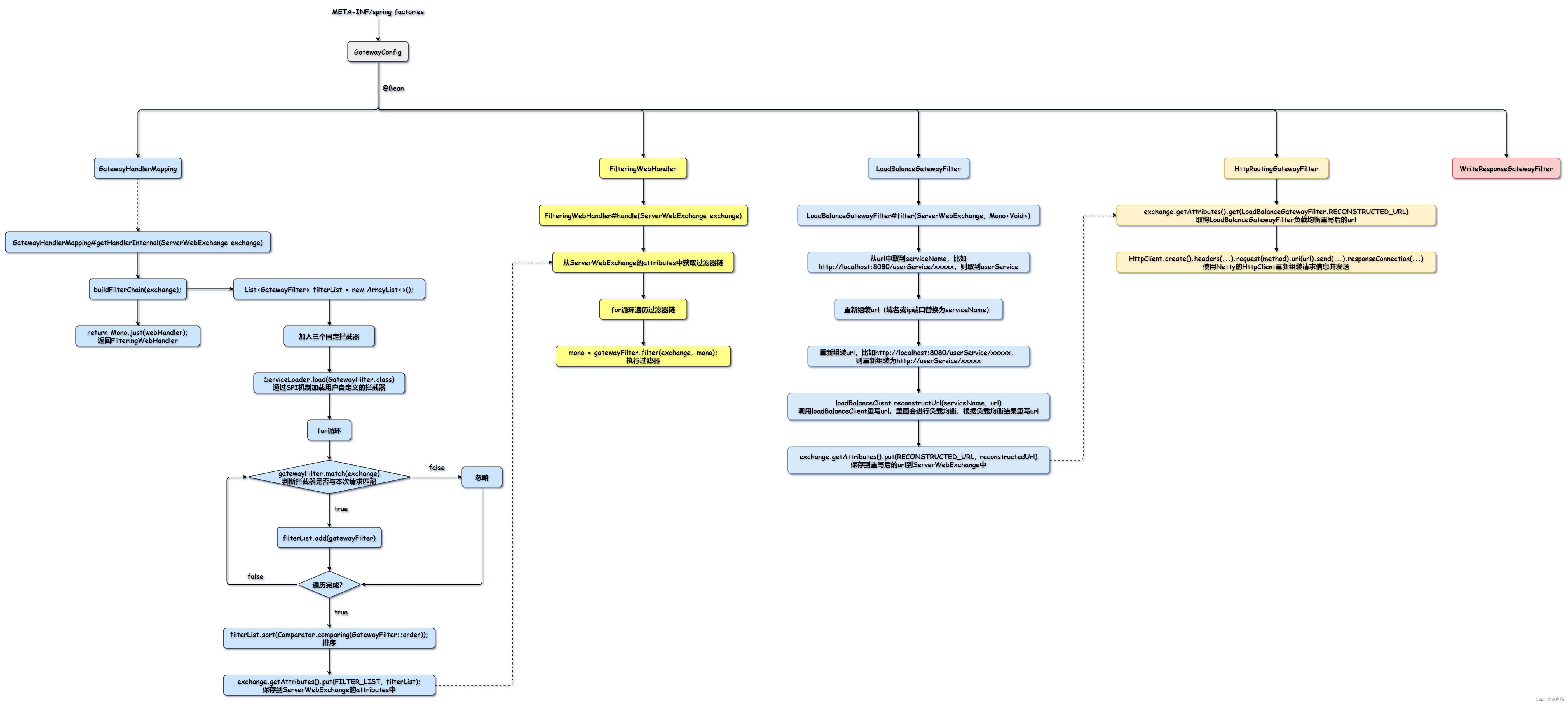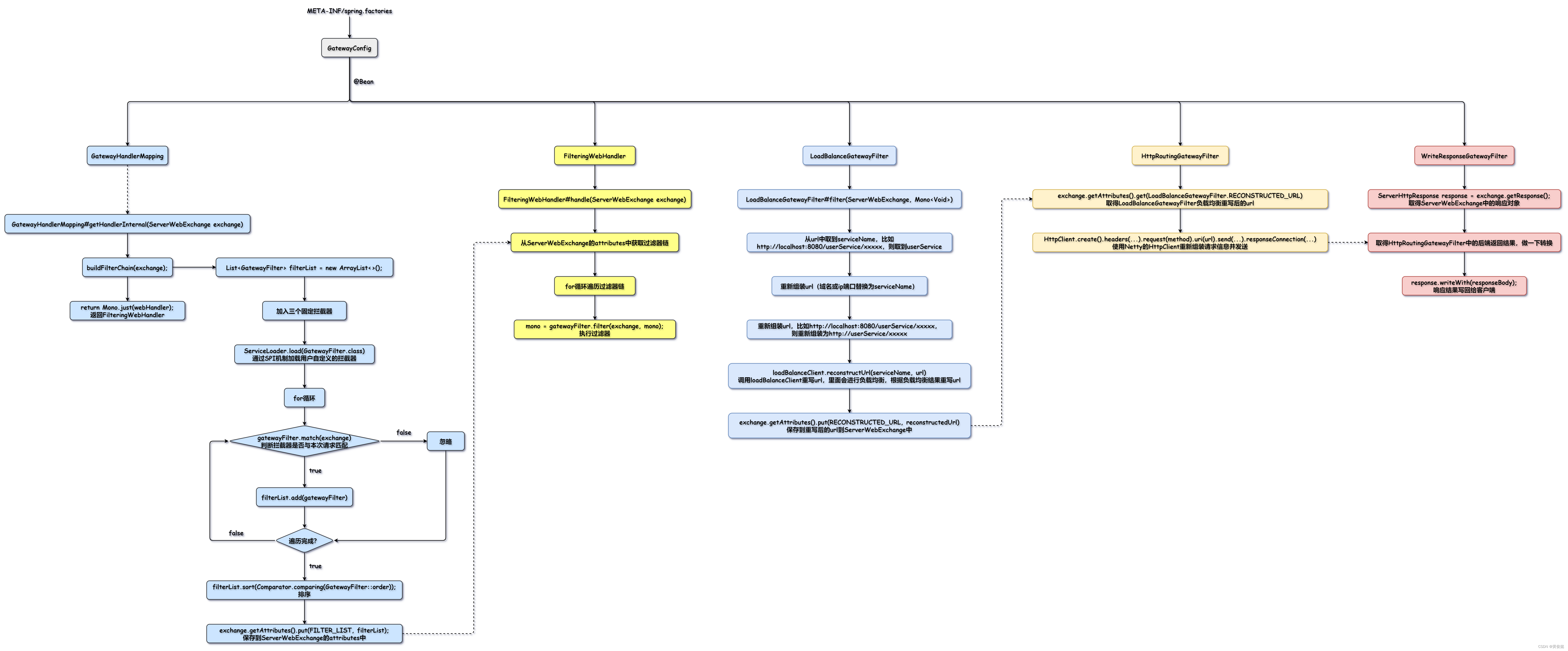 我们通过SpringBoot的自动装配机制加载我们的配置类GatewayConfig,通过GatewayConfig向Spring容器注册我们的核心类型:GatewayHandlerMapping、FilteringWebHandler以及三个固定的拦截器。