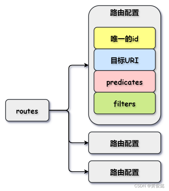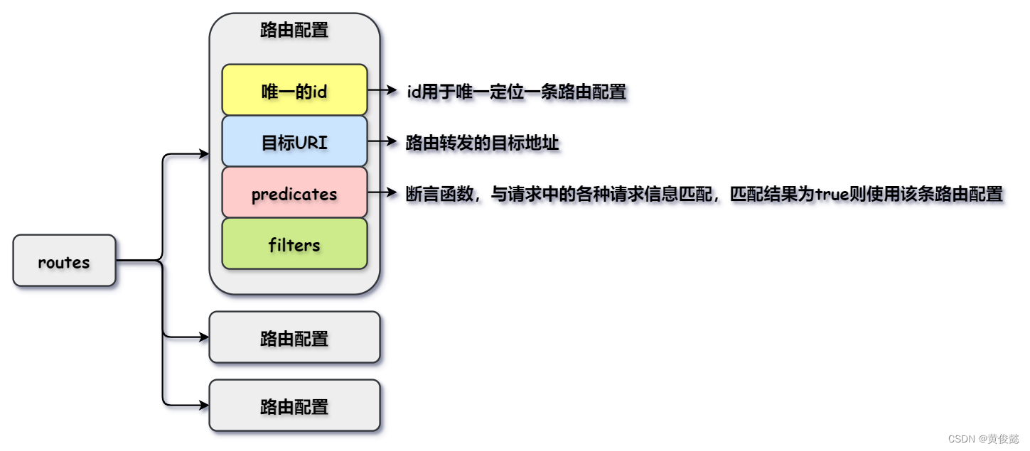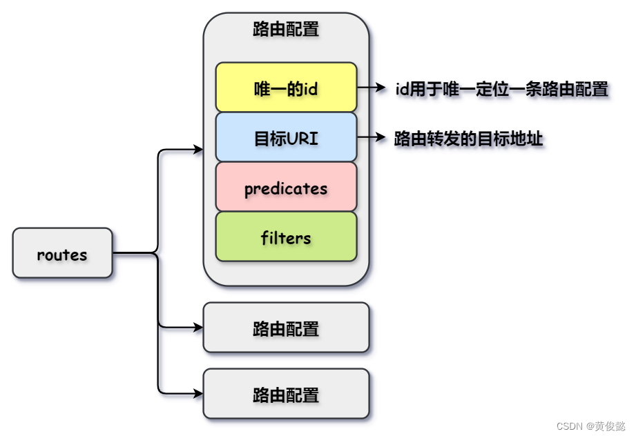 路由是yml配置文件中最基础的部分,它在yml配置文件中就是routes配置,routes配置是数组格式,数组中每个配置项是一个路由配置,每个路由配置包括一个唯一的id、目标URI、一组断言(predicates)、一组过滤器(Filter)。
