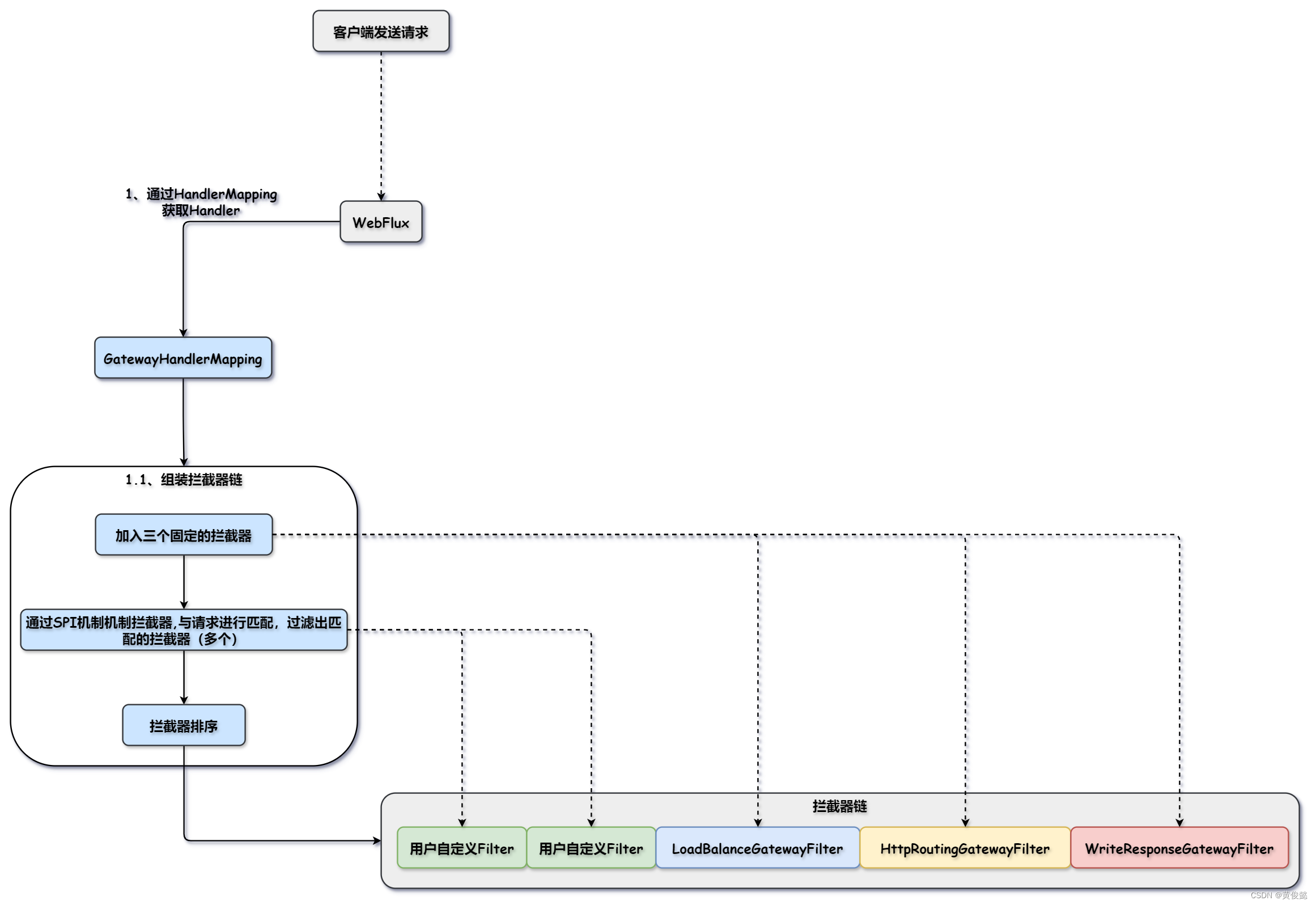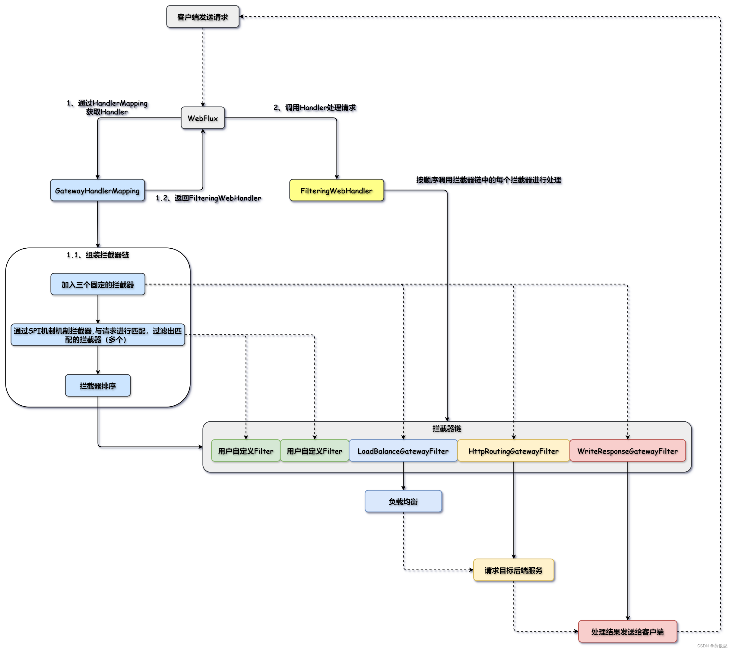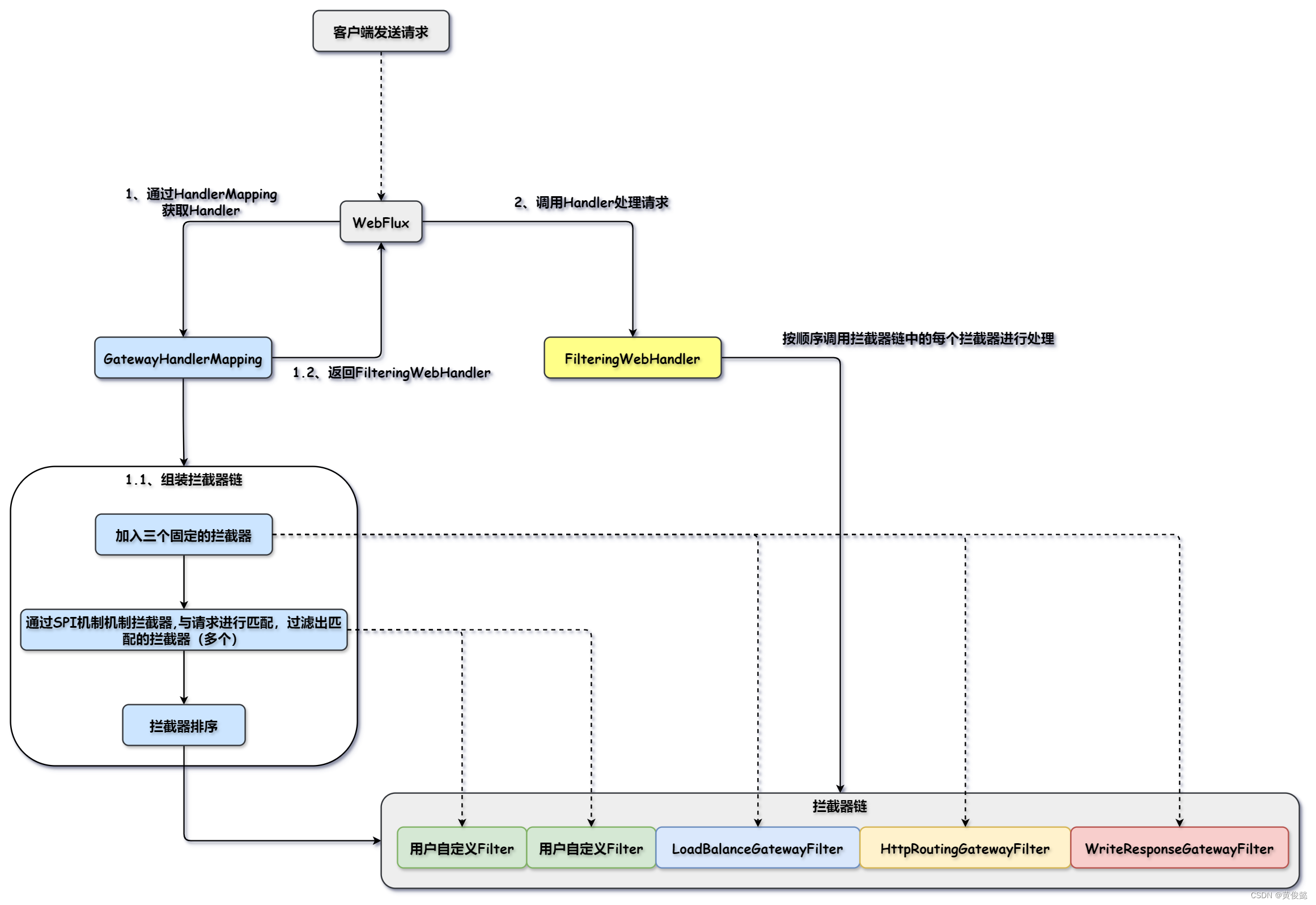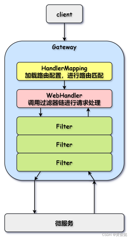 Gateway基于Spring-WebFlux ,实现了WebFlux的两个核心组件HandleMapping 和WebHandler。