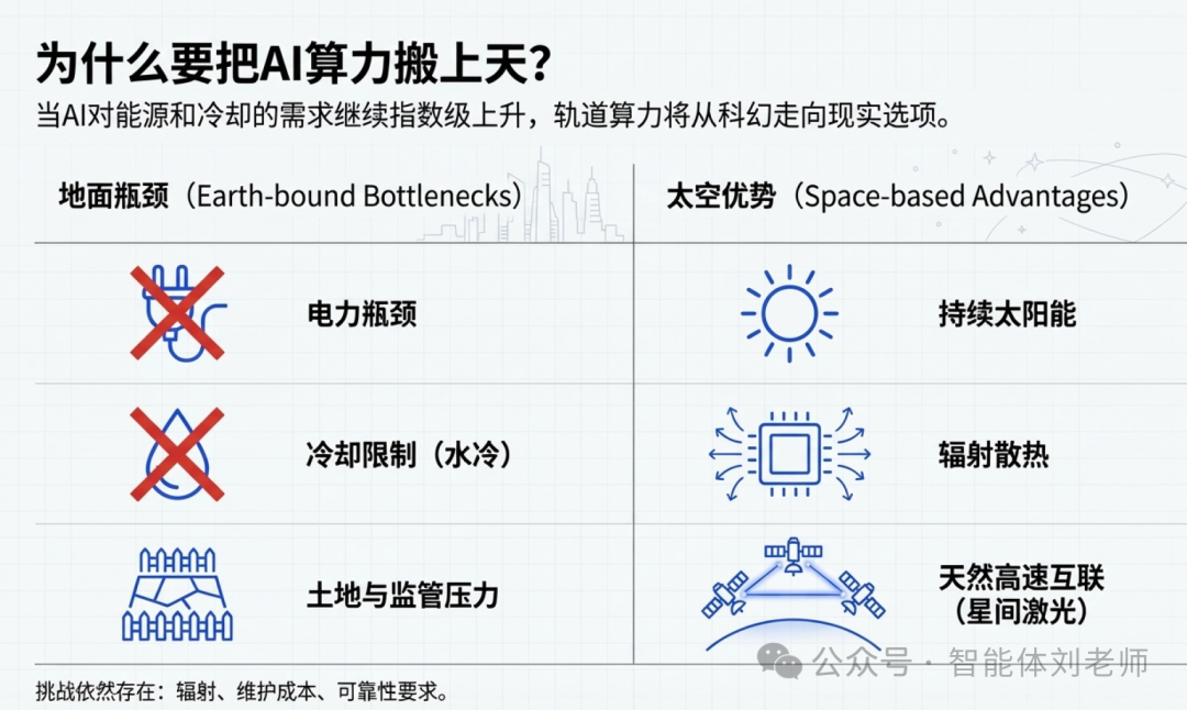 电:轨道上可持续获取太阳能(无需地面电网扩容),理论上更接近"按需扩张"。